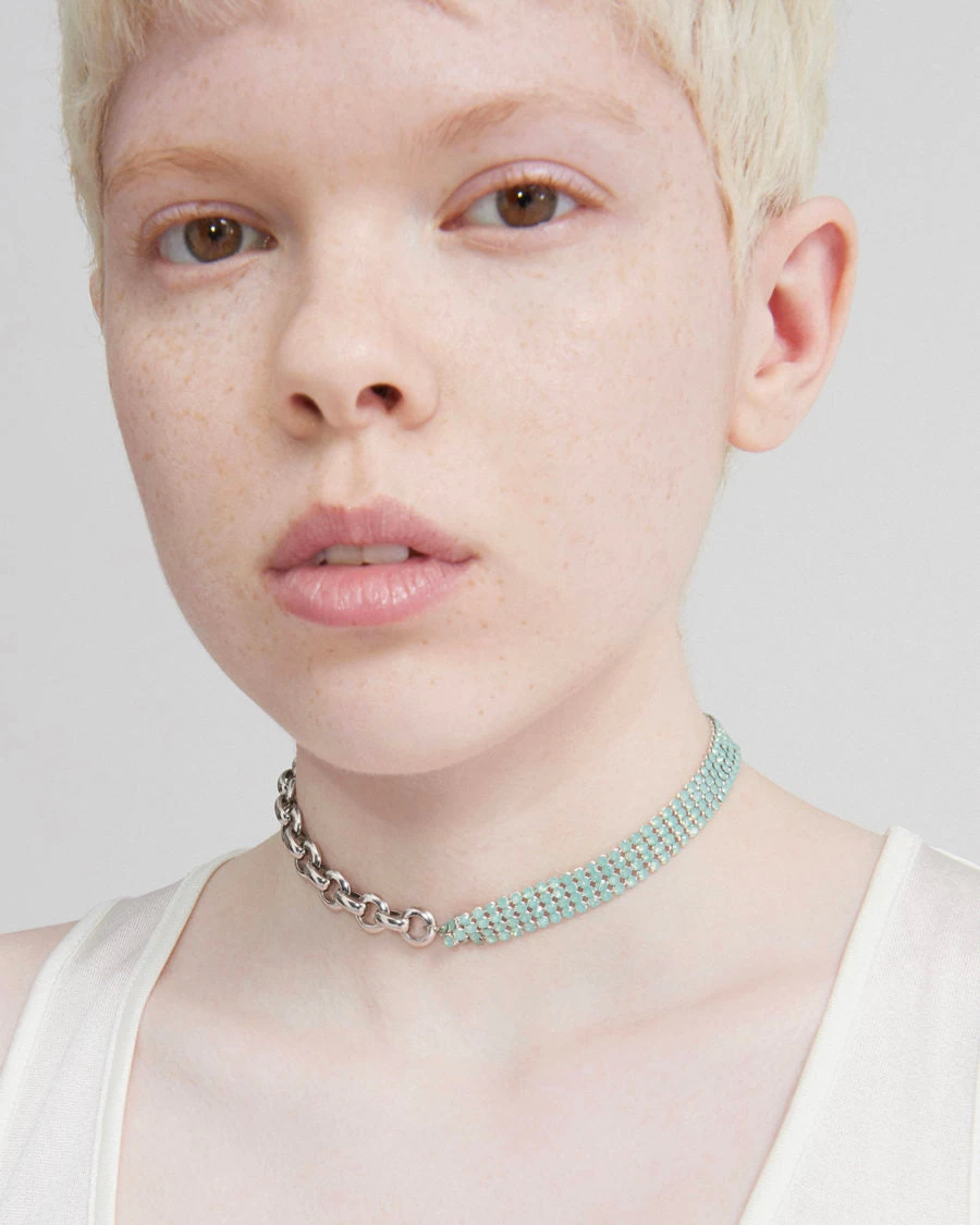 Justine Clenquet’s jewelry is handmade in France using time-honored techniques, so each piece can be treasured forever. Made of palladium-dipped brass, the ‘River’ hybrid choker features pacific opal Swarovski crystals and a cable chain. Wear yours centered with both the crystals and chain showing for a modern look. Â Â