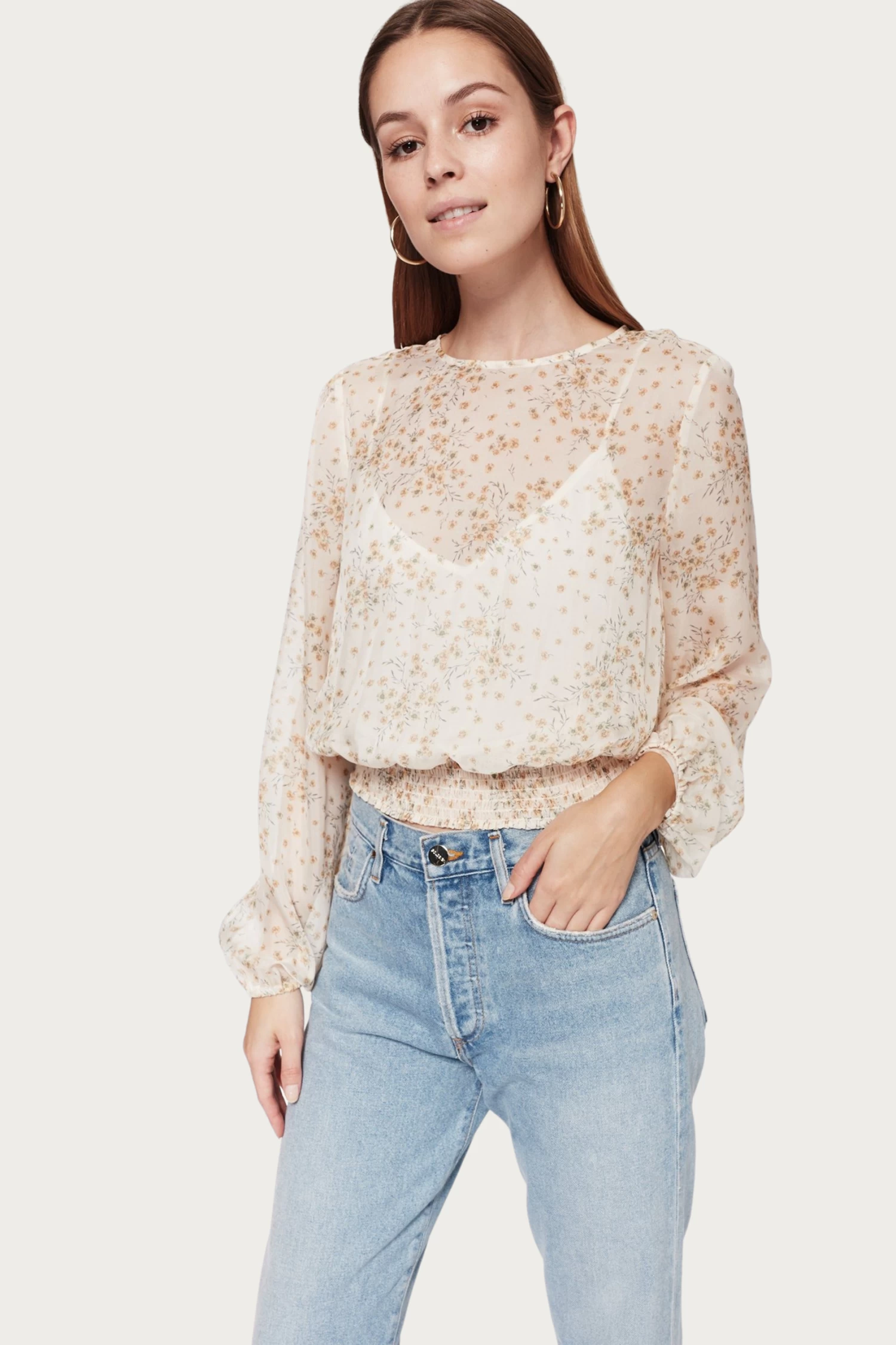 For an elegant addition to your warm-weather wardrobe, look no further than the ‘Robyn’ top from Cami NYC. Constructed from silk chiffon In ivory with pale yellow florals, it has a relaxed silhouette and a smocked hem with a jersey inner cami to temper the sheer bodice. Style yours with high-rise shorts and strappy sandals.