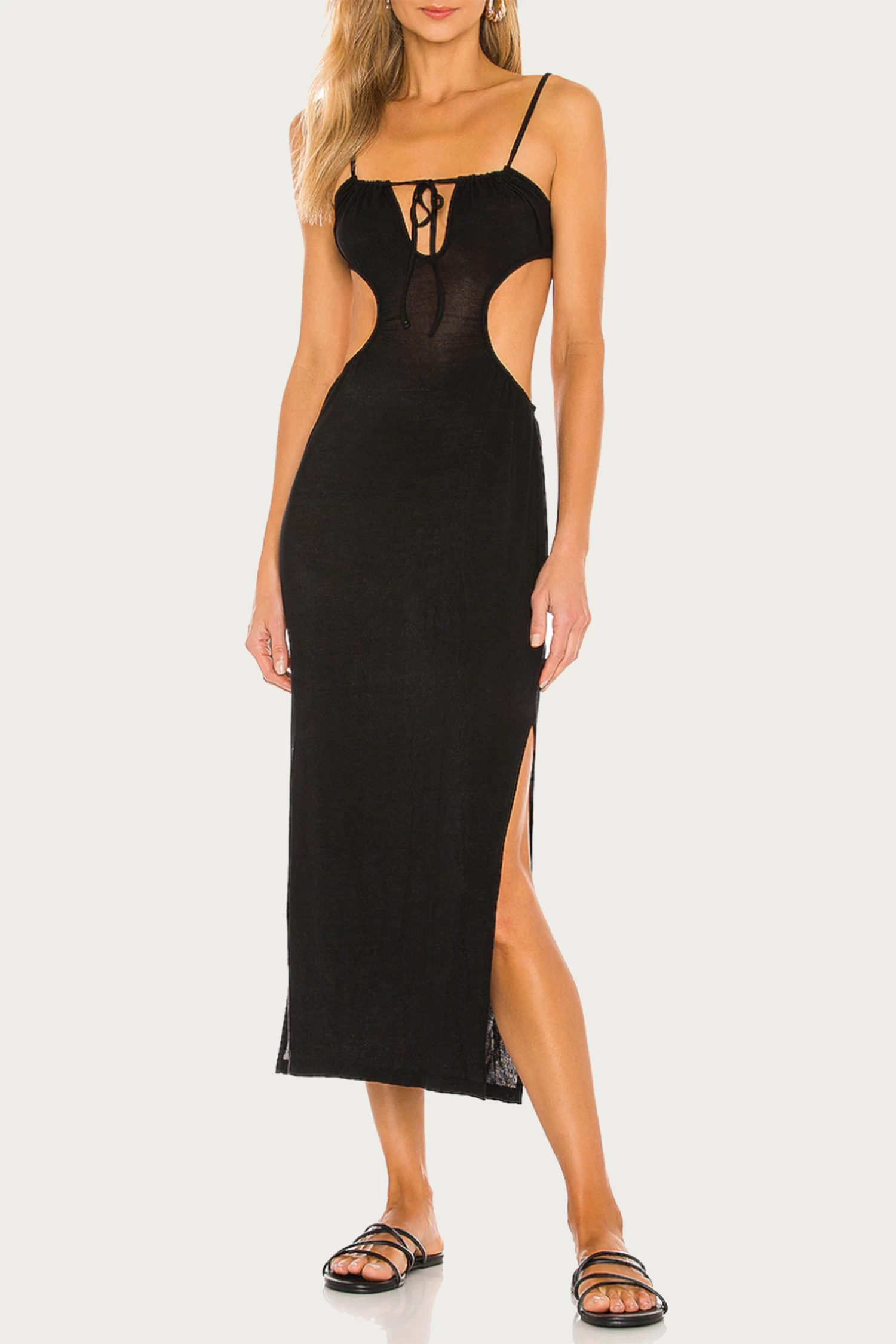 WeWoreWhat’s maxi cover-up ensures your ensemble will be the envy of the beach crowd. This lightweight dress has cutout detailing and a ruched neckline with self-ties. Layer yours over a vibrant bikini or center it with a gold necklace.