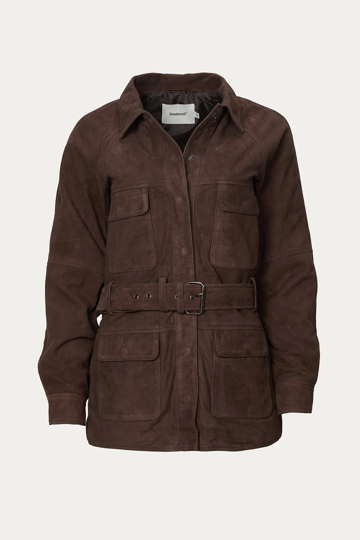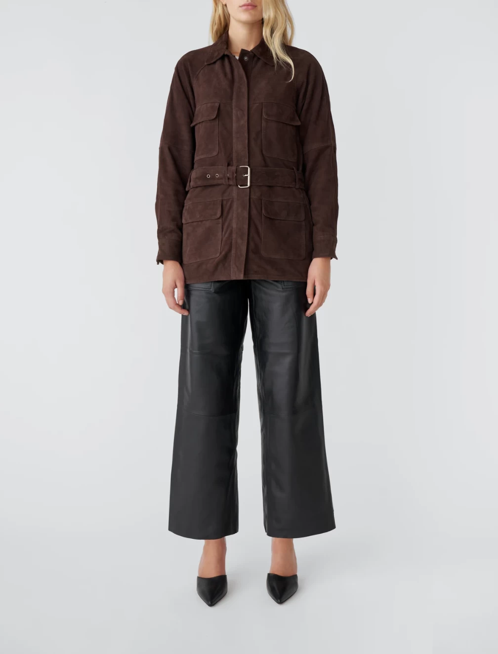 This suede jacket from Deadwood, with its belted waist and multiple pockets, reminds us of ’70s safari tropes. Made in Sweden from recycled goatskin suede, it is cut to a relaxed silhouette – which can be cinched via the accompanying belt. Team yours with flared pants and loafers to complete your look.