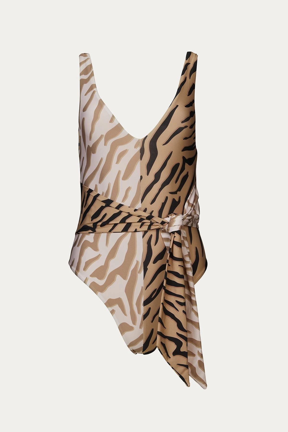 Update your vacation edit with Beach Riot’s ‘Samira’ zebra swimsuit. It has a low-scoop neckline and high-cut leg that elongates your figure. Adjust the waist sash to your desired fit. Wear it with an oversized sun-hat and slides for a beach-ready look.