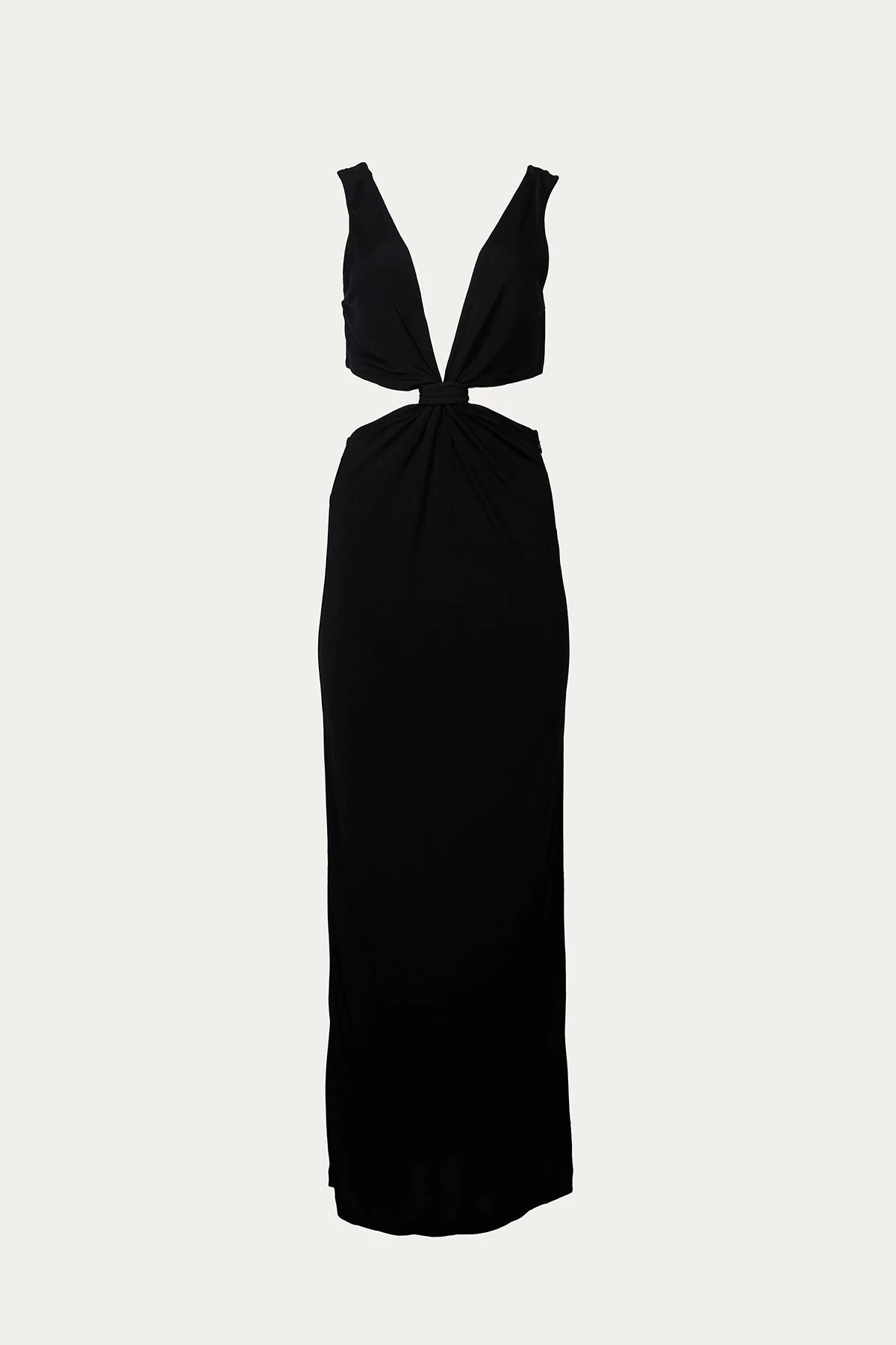 Ronny Kobo’s woman isn’t one to shy from sensuality with pieces like this ‘Sammy’ dress. Cut from black stretch-jersey that flatters all body types, it’s thoughtfully detailed with side cutouts, a plunging V-neckline and a floor-sweeping silhouette.Â