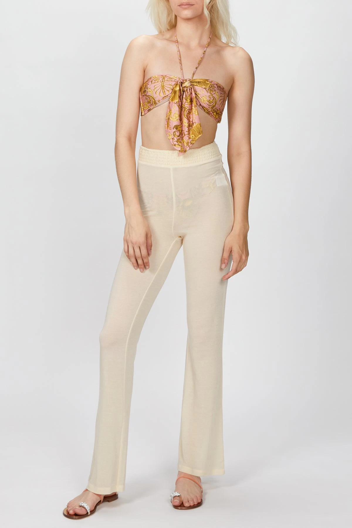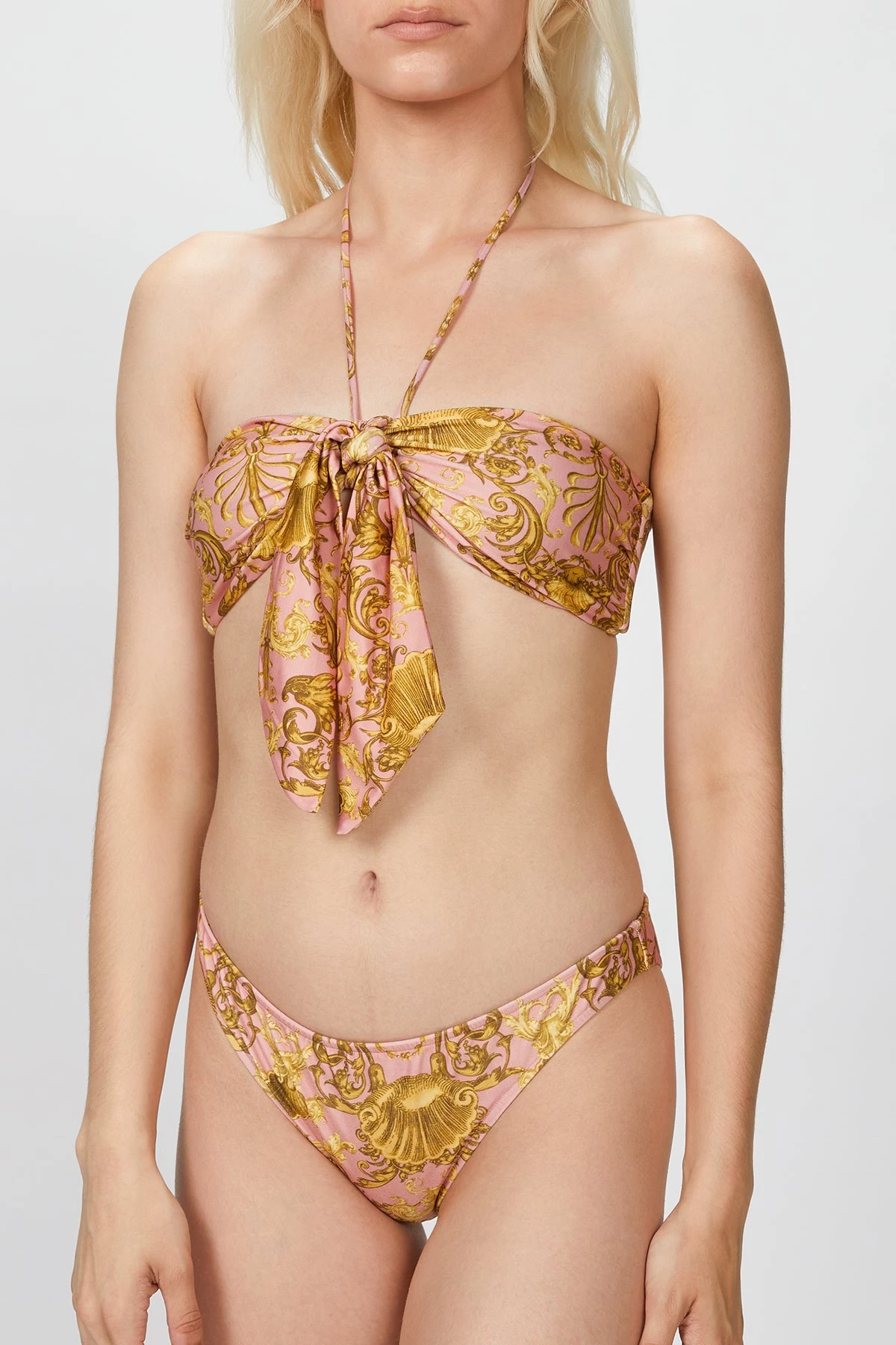 Printed with vintage-inspired illustration, Adriana Degreas’ bikini set embodies getaway glamour. Made in Brazil from pink and gold technical stretch-swim fabric, it has a halterneck strap and knotted center. Sold as a set.