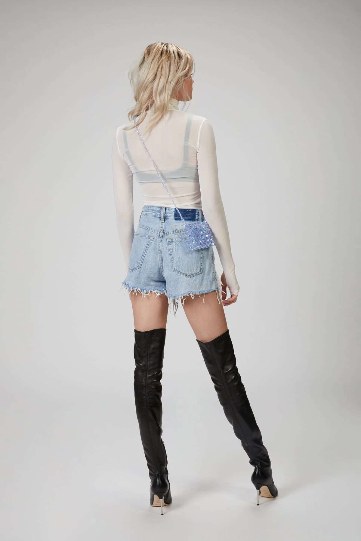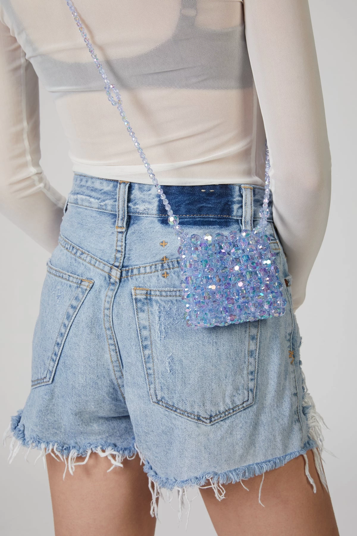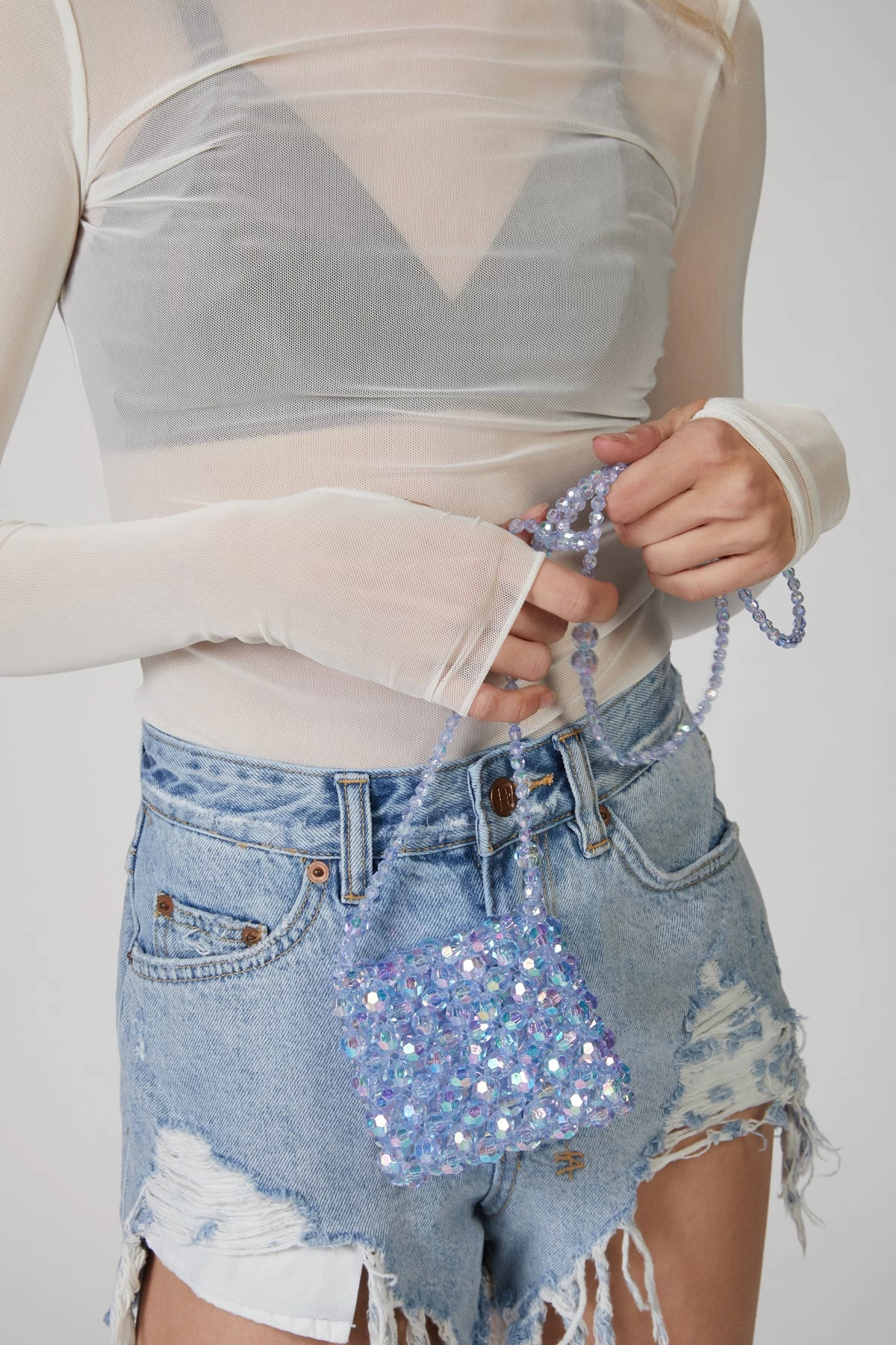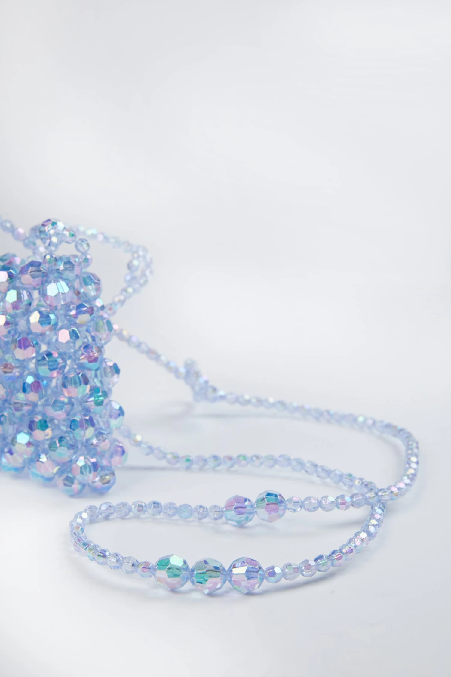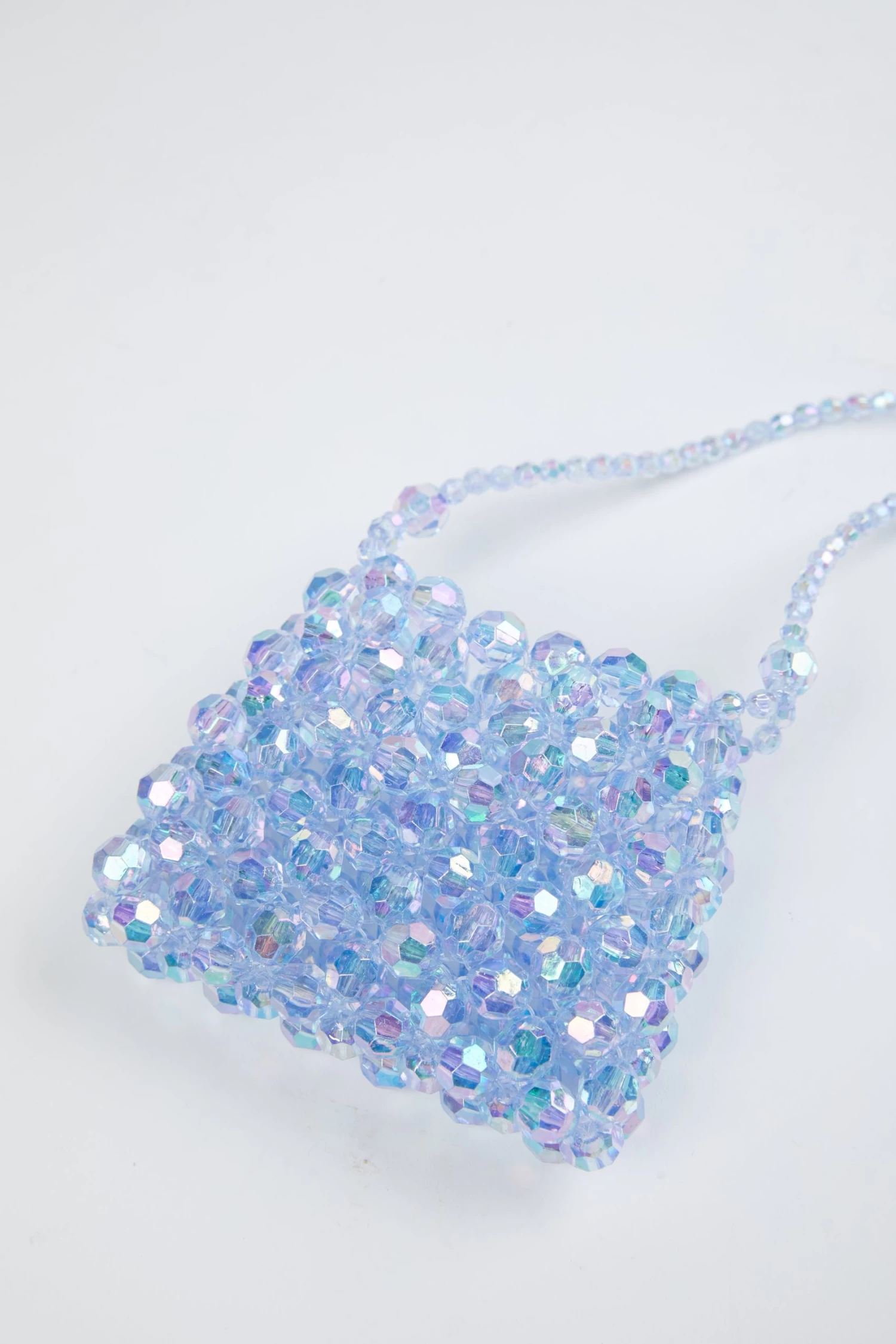 Mini bag made in clear blue beads. Complete with a shoulder strap in matching beads.