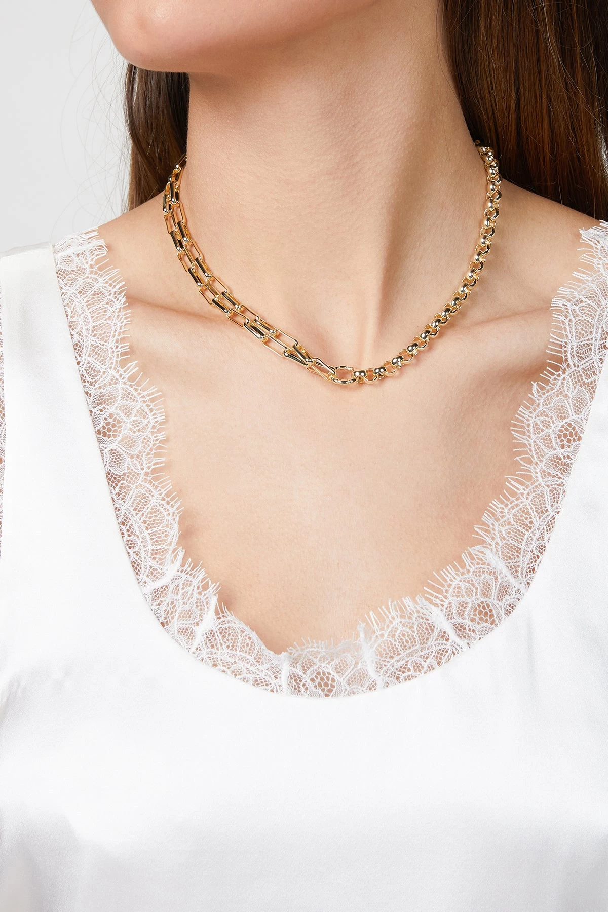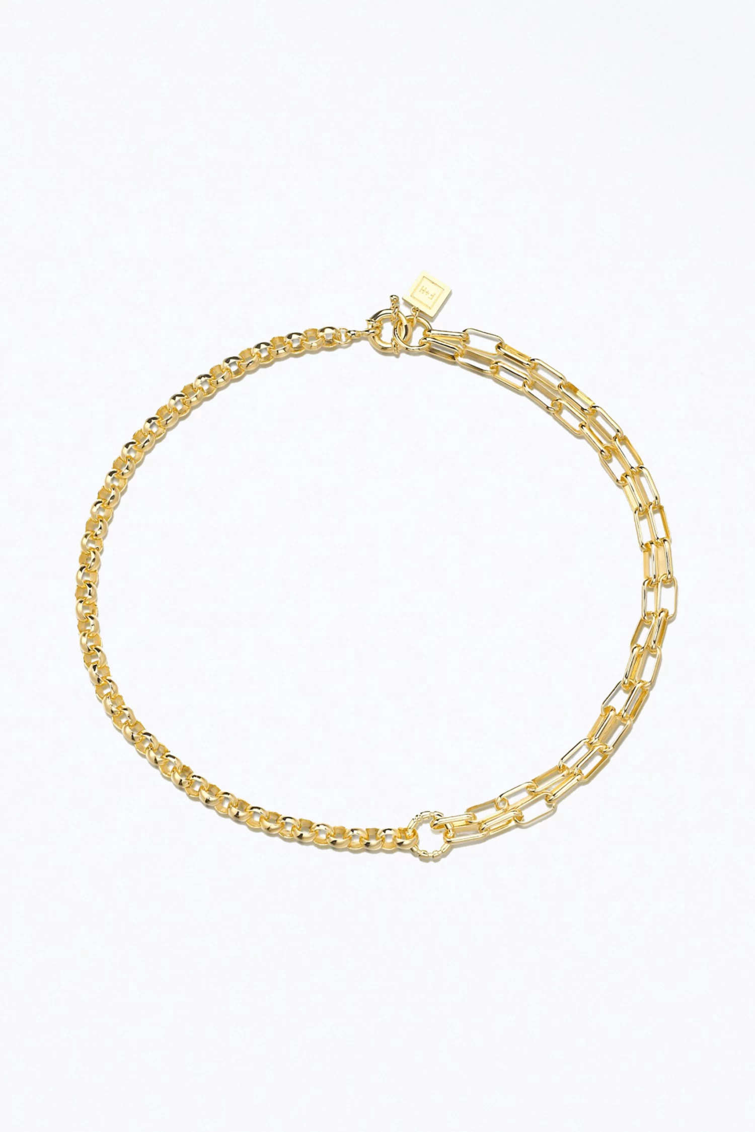 Handmade in Australia, F+H Studios’ ‘Slash’ necklace is comprised of two mismatched chains joined by a statement link. Make it an everyday signature and wear it alone or stacked with various chains from the label.