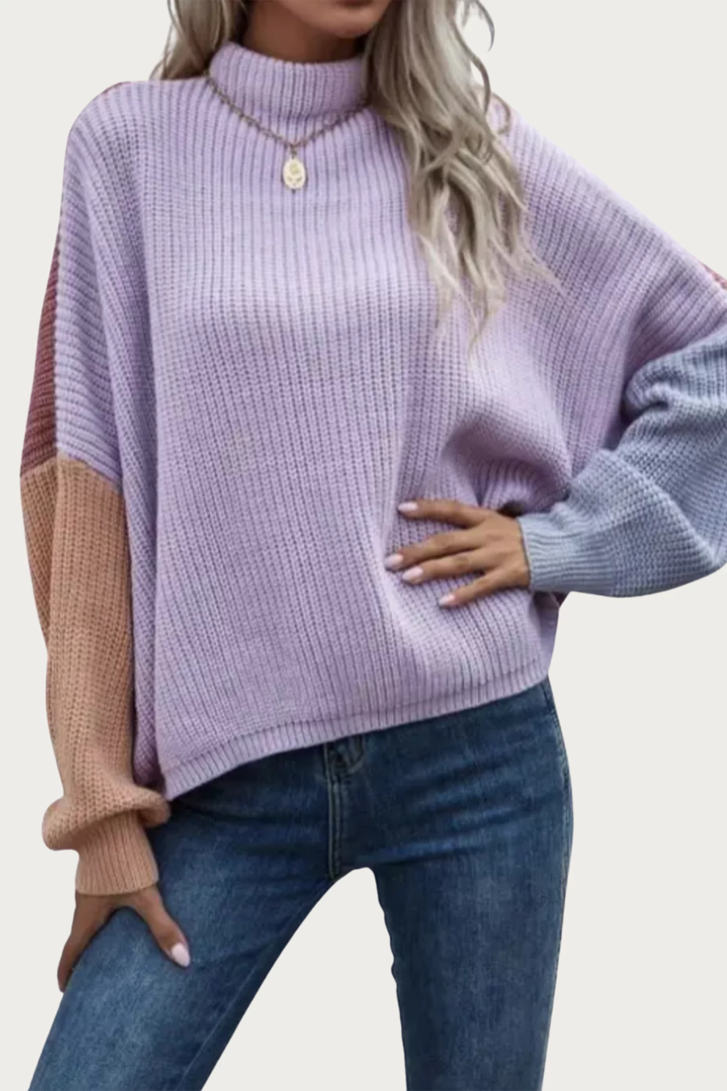A mid-weight knit and dolman sleeves lend a flattering drape to Trend Shop’s colorblock sweater. Made of lavender, blue, gold and rose hues, the effortless design has an oversized fit enhanced by dropped shoulders. Throw yours on with jeans and sneakers for casual weekends.Â