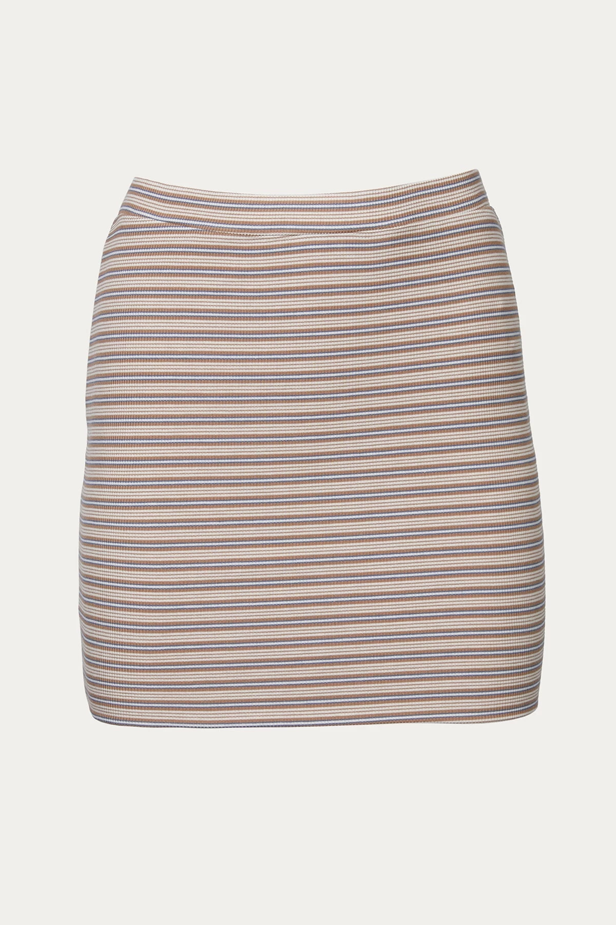 Chic and comfortable, Endless Blu’s figure-skimming skirt is made from ribbed stretch-modal and hits at the mid-thigh. It is patterned with stripes in brown and beige hues and has a comfortable elasticated, high-rise waist. Style yours with a half-tucked oversized T-shirt and sneakers.Â