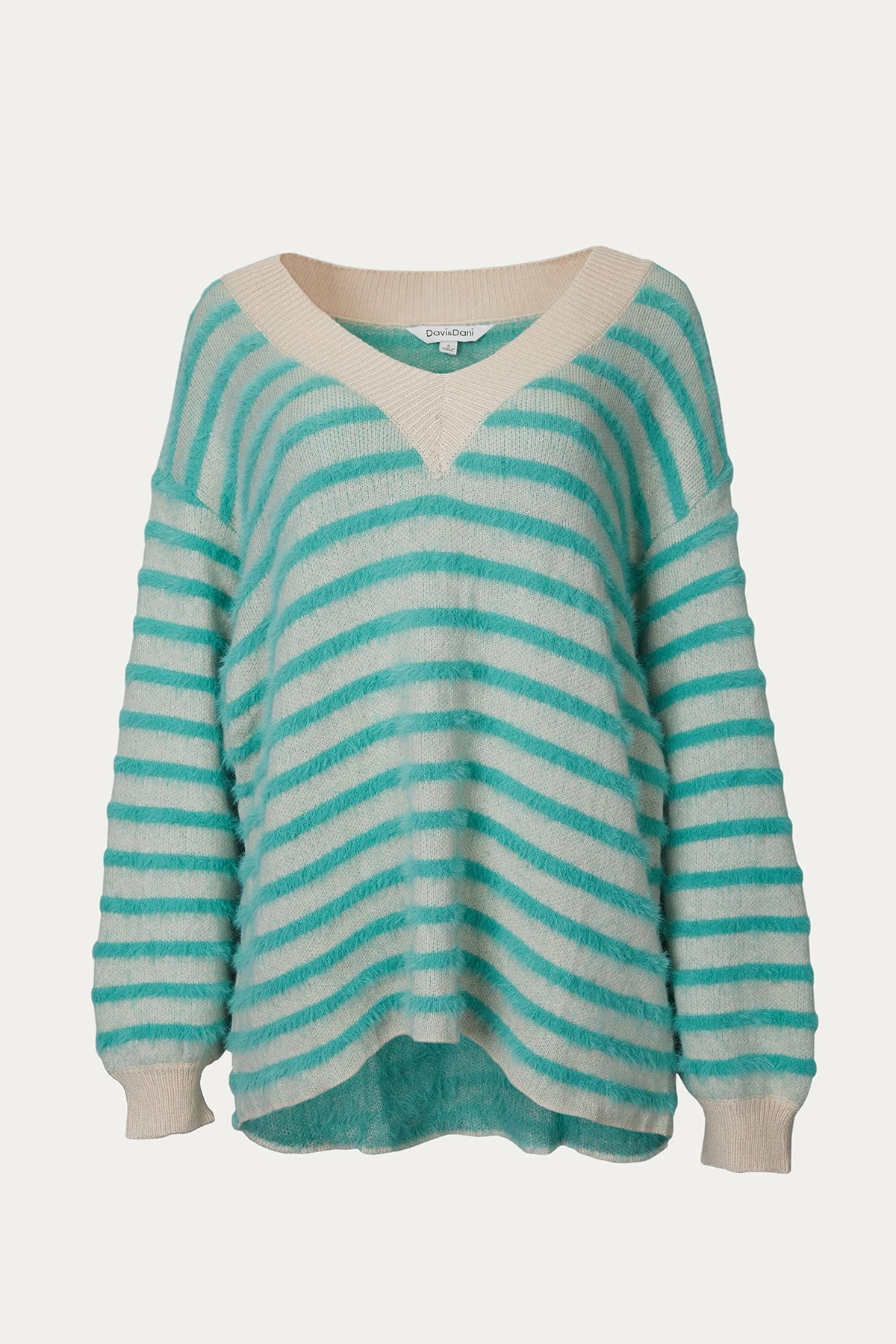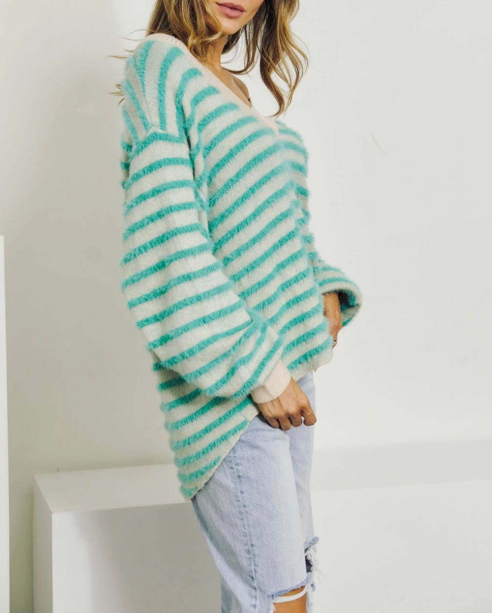 J.NNA’s sweater has been knit with vibrant turquoise stripes and meets the label’s exacting standards of softness and quality. It features a V-neckline that can be worn on or off the shoulder and has an oversized, slouchy fit emphasized by dropped shoulders. Wear yours with jeans and sneakers for casual weekends.
