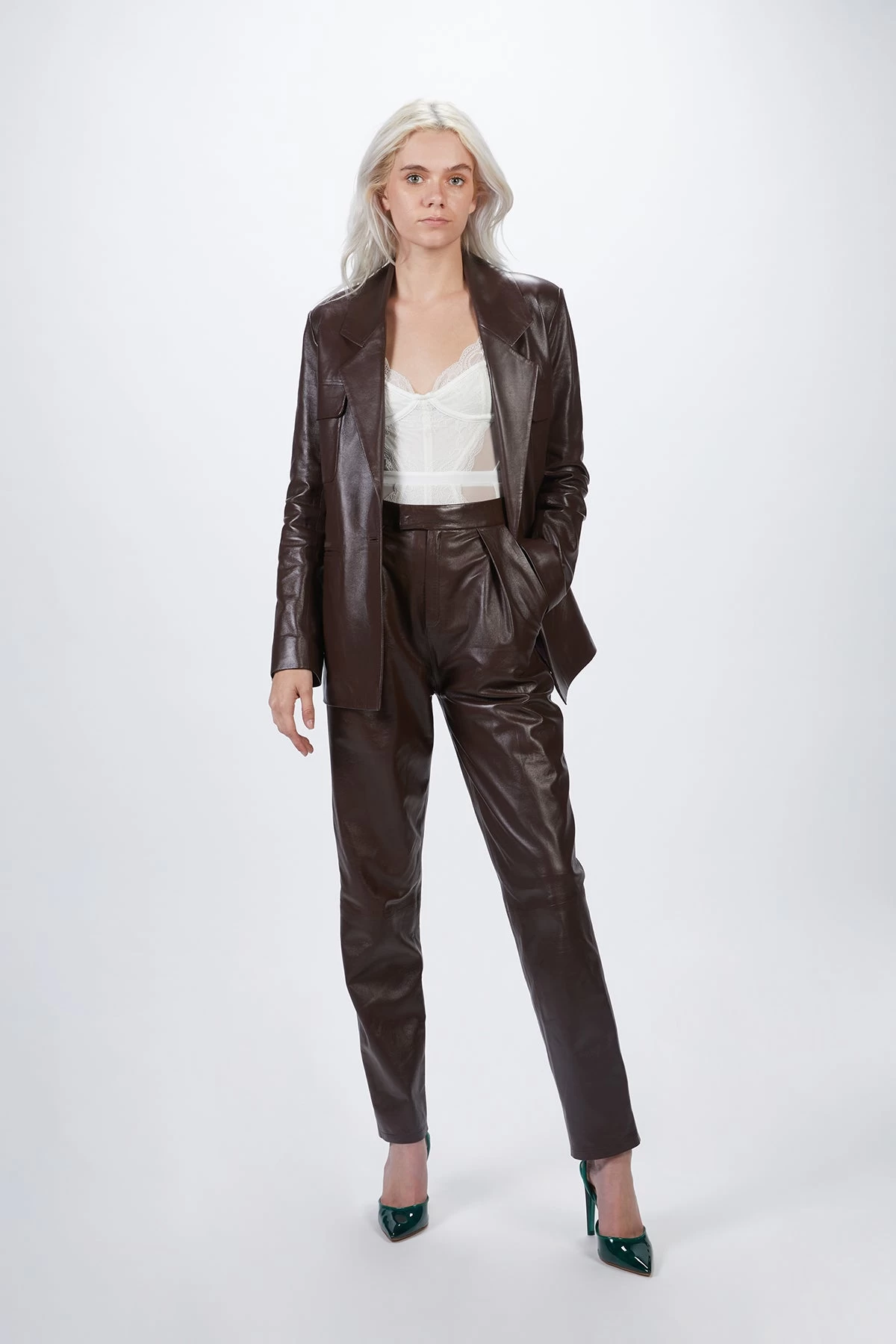Made from buttery lamb leather with a high-shine finish in Turkey, this timeless piece will take you from day to night, year after year. It features notched lapels, two breast flap patch pockets and two front slit pockets. This single-breast style is fully lined in lustrous silk for the perfect drape. Pair with the label’s matching ‘Pleated Leather Pants’ to complete the look.