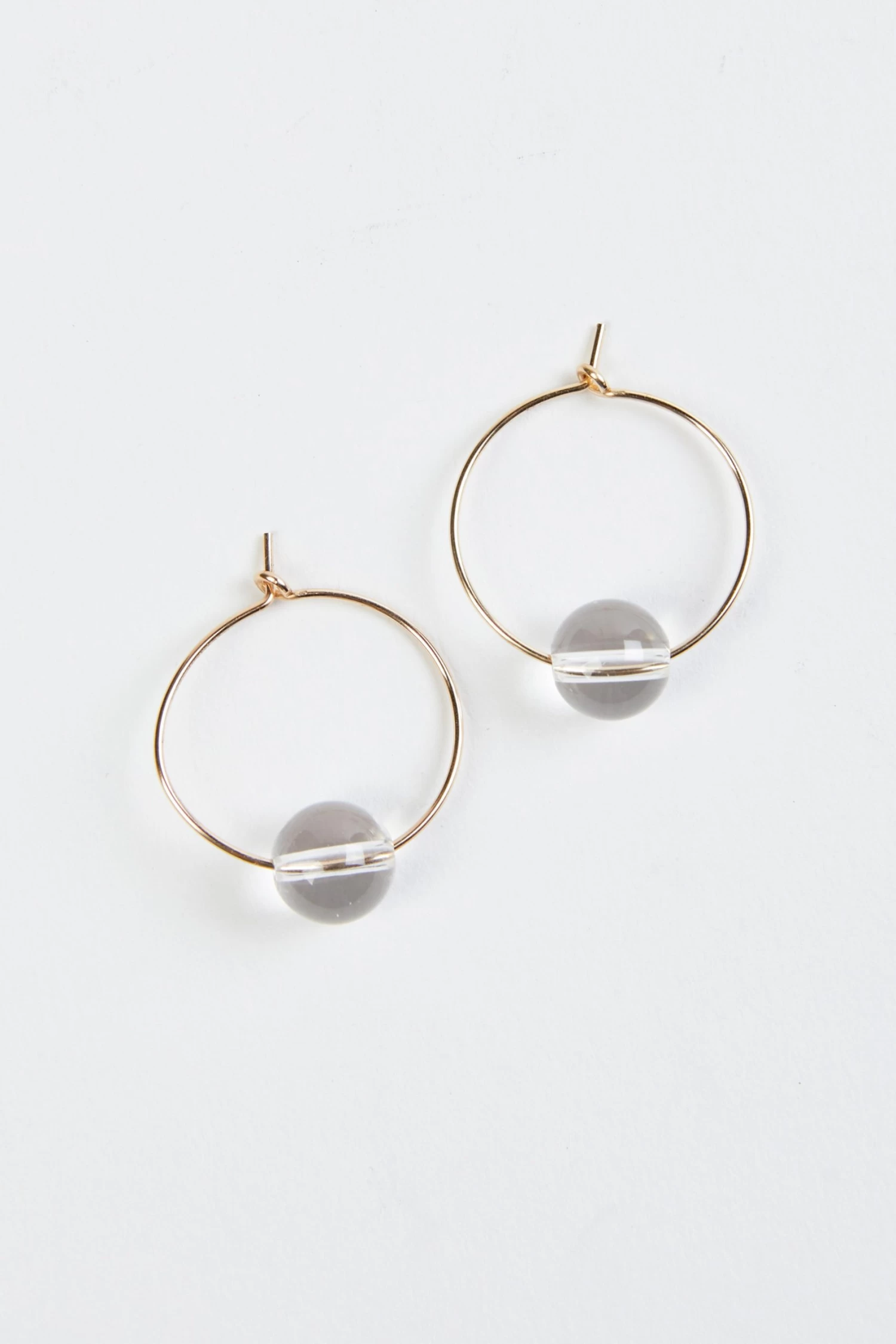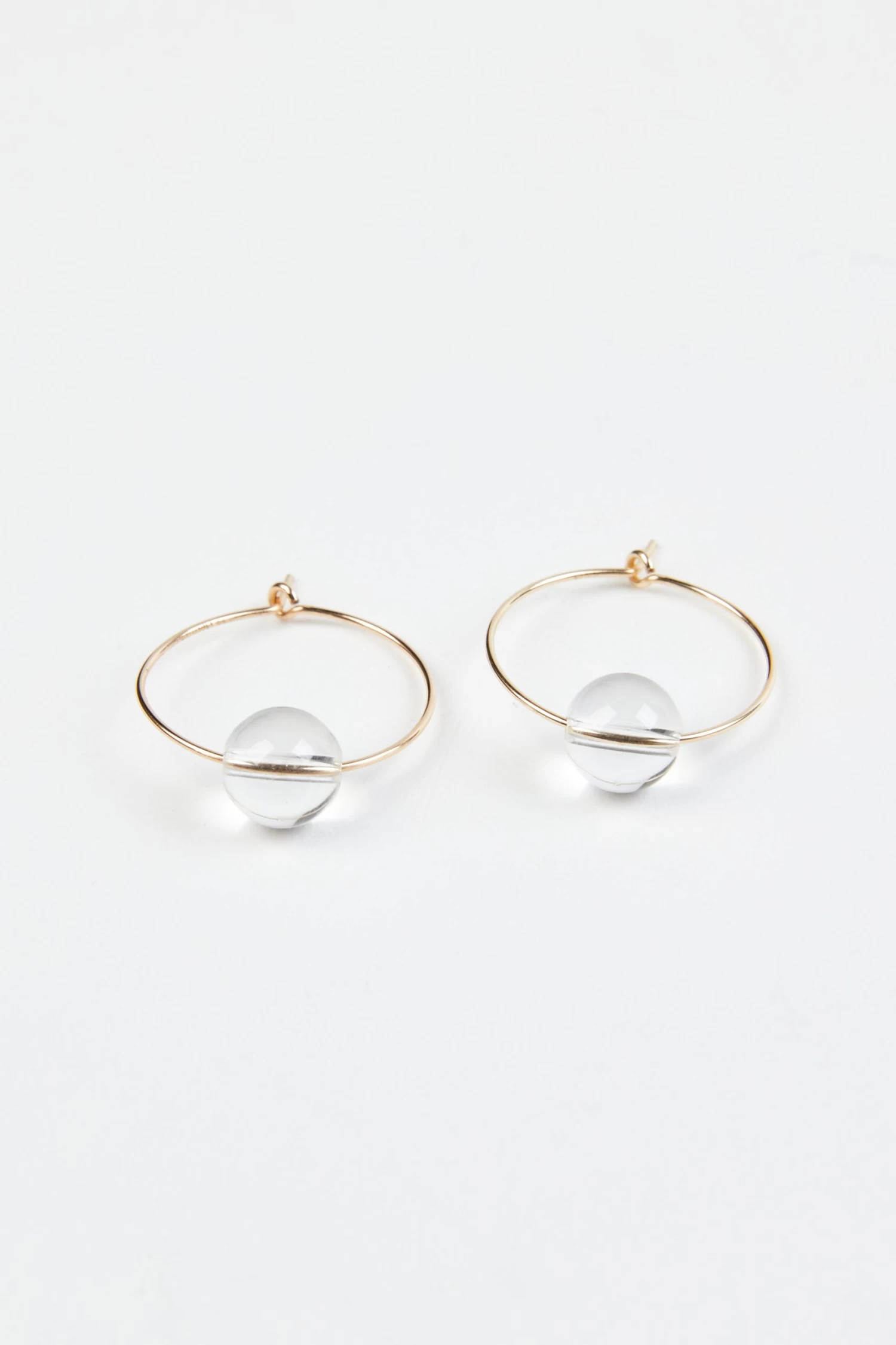 Perfect for a night out with the girls, give an unexpected look and pair these Tahoe Hoops with the Baguette Threaders above the Open Back Knit Bodysuit for an eye-catching look. These hoop earrings are individually handmade with clear crystal quartz and may vary in size.