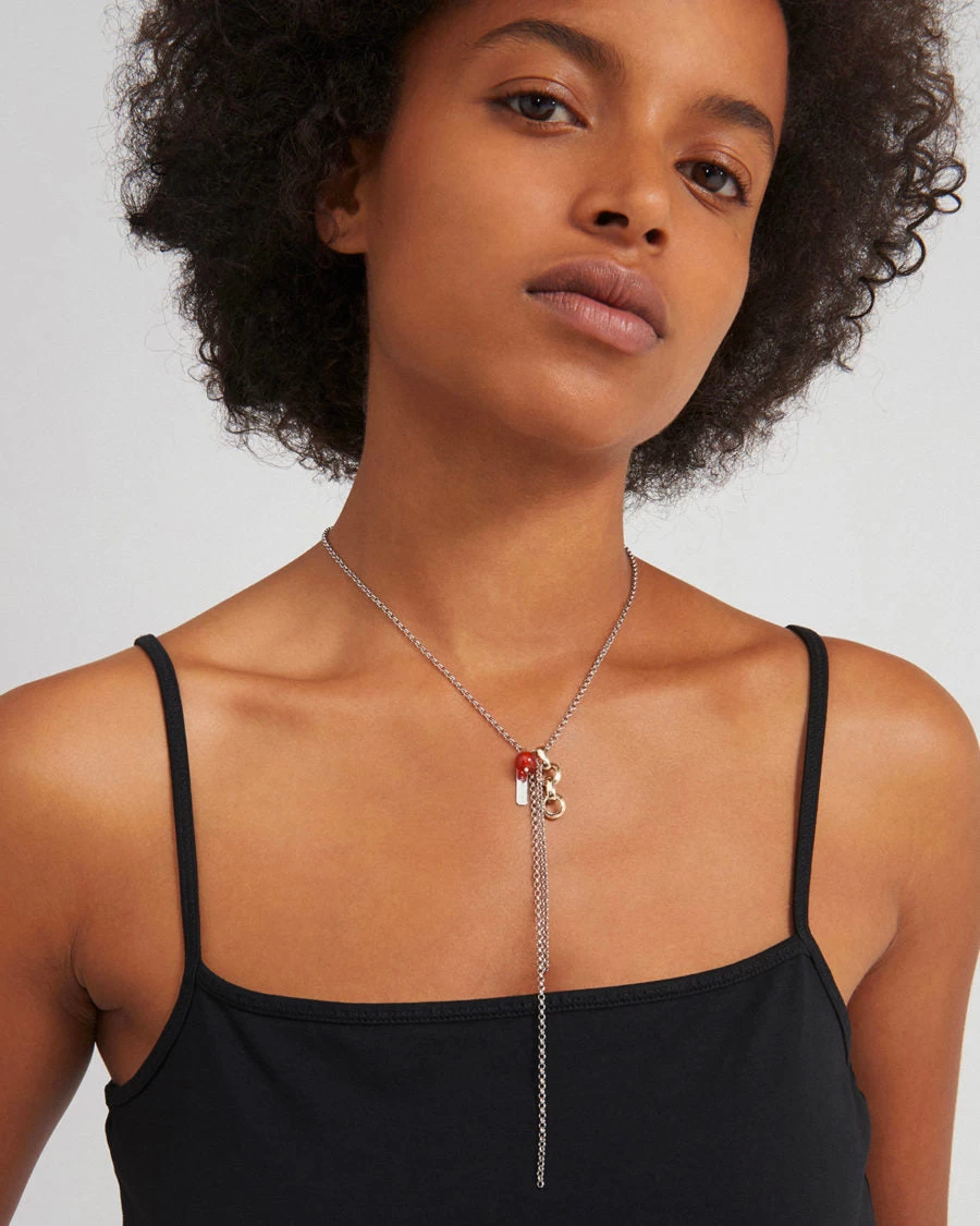 Justine Clenquet’s designs are at the top of many jewelry lovers’ wish list, thanks to one-of-a-kind styles like this necklace. Designed and handmade in France, this lariat-style piece is strung with a red agate pearl suspended from a cable chain. The silhouette will look great with plunging necklines.Â