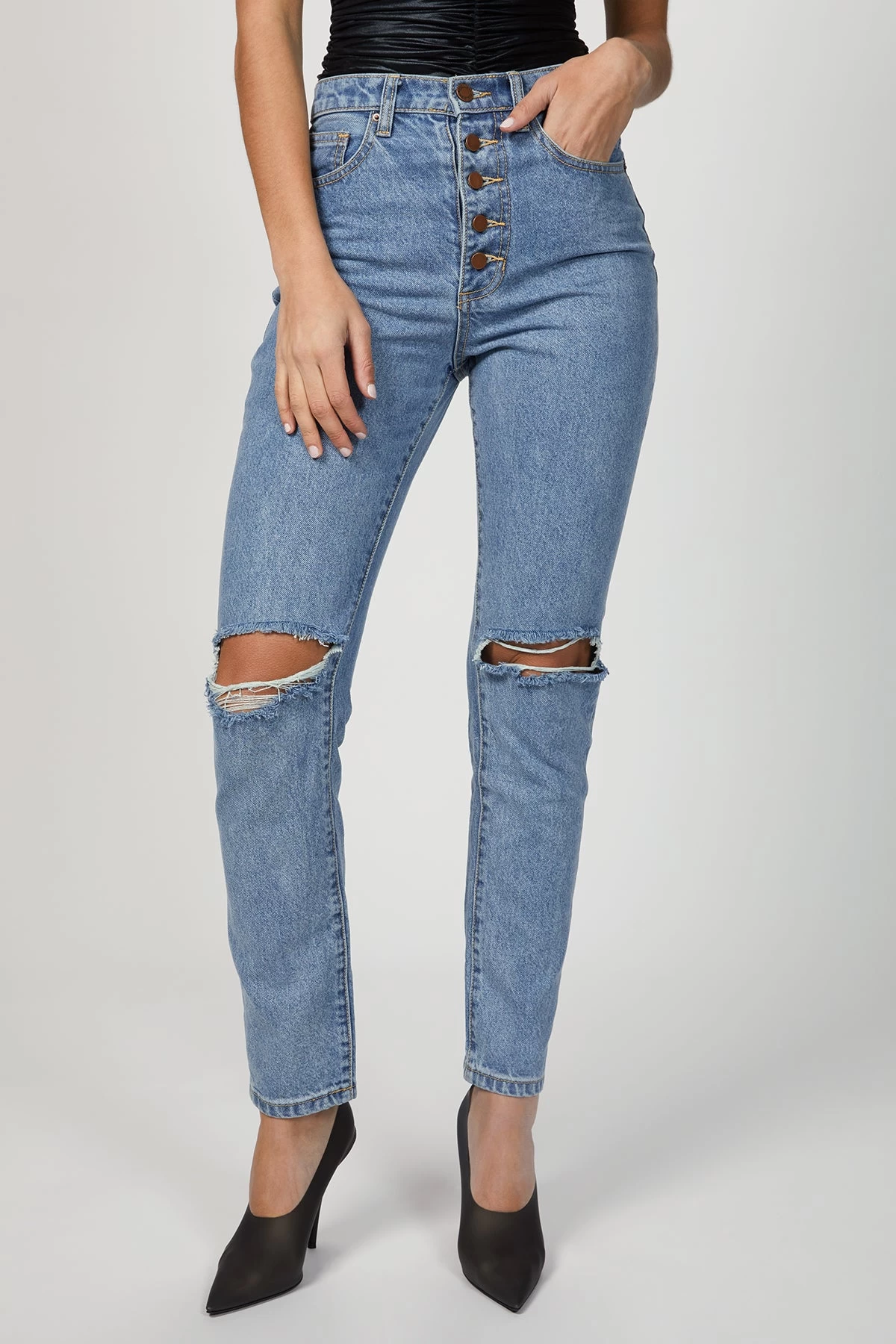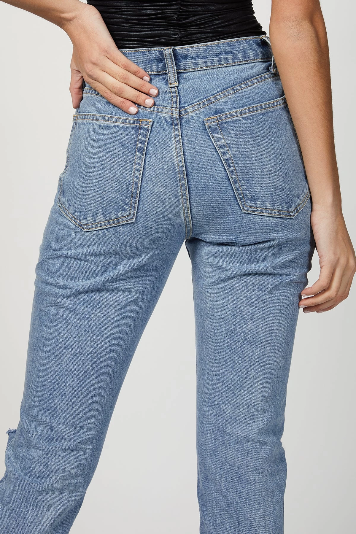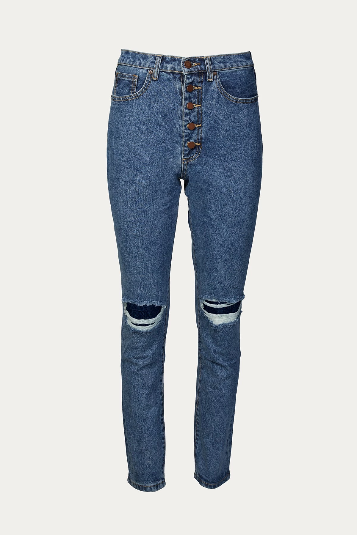 The Distressed Danielle Jean is a relaxed wardrobe staple. With vintage charm in a rich indigo cotton denim, these jeans have a rigid feel yet designed for maximum comfort. Signature detailing – five pockets, button closure and an antiqued brass trim – lend a retro feel that’s further enhanced by expert distressing at the knees. With a high rise waist that falls to a straight leg, style them as part of a variety of casual everyday edits.