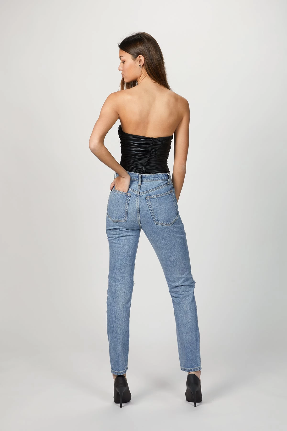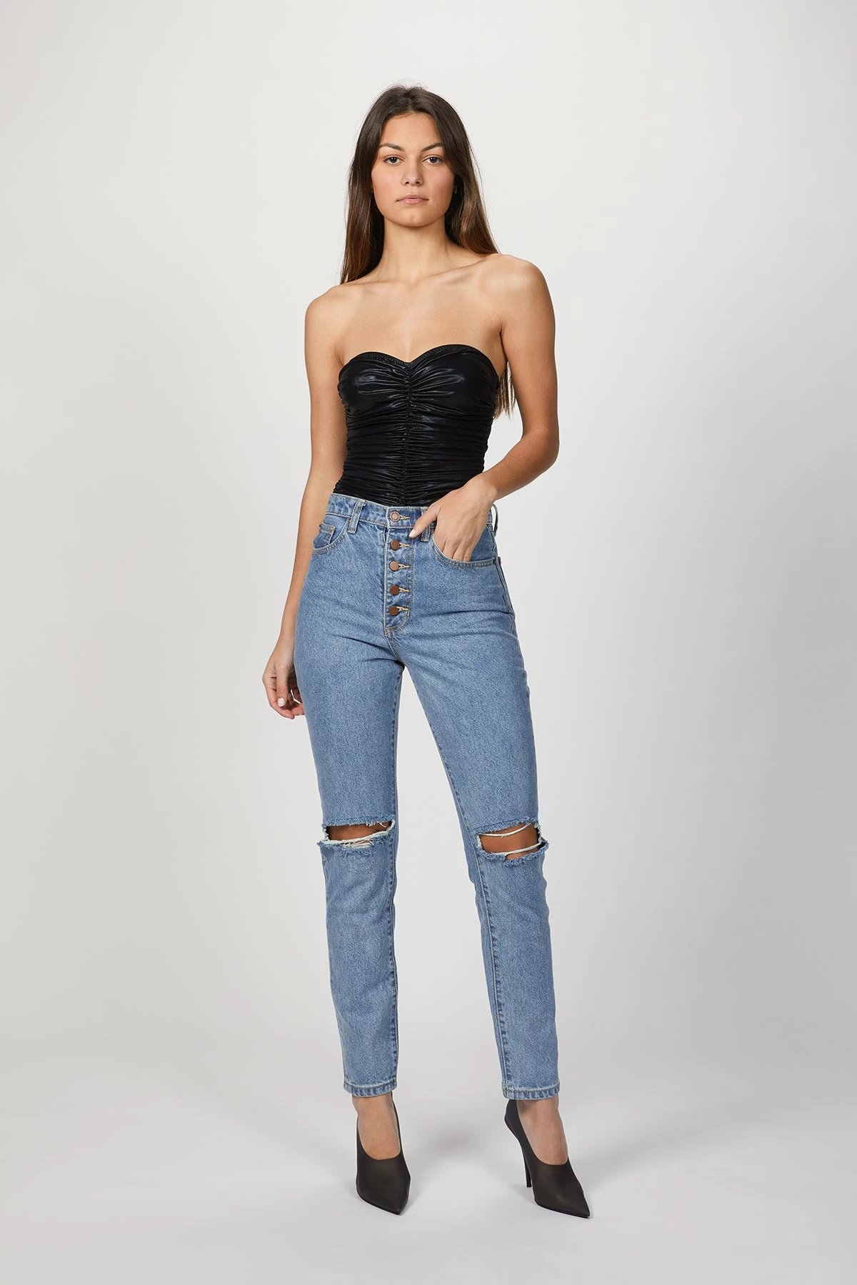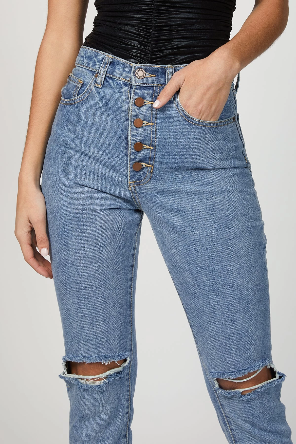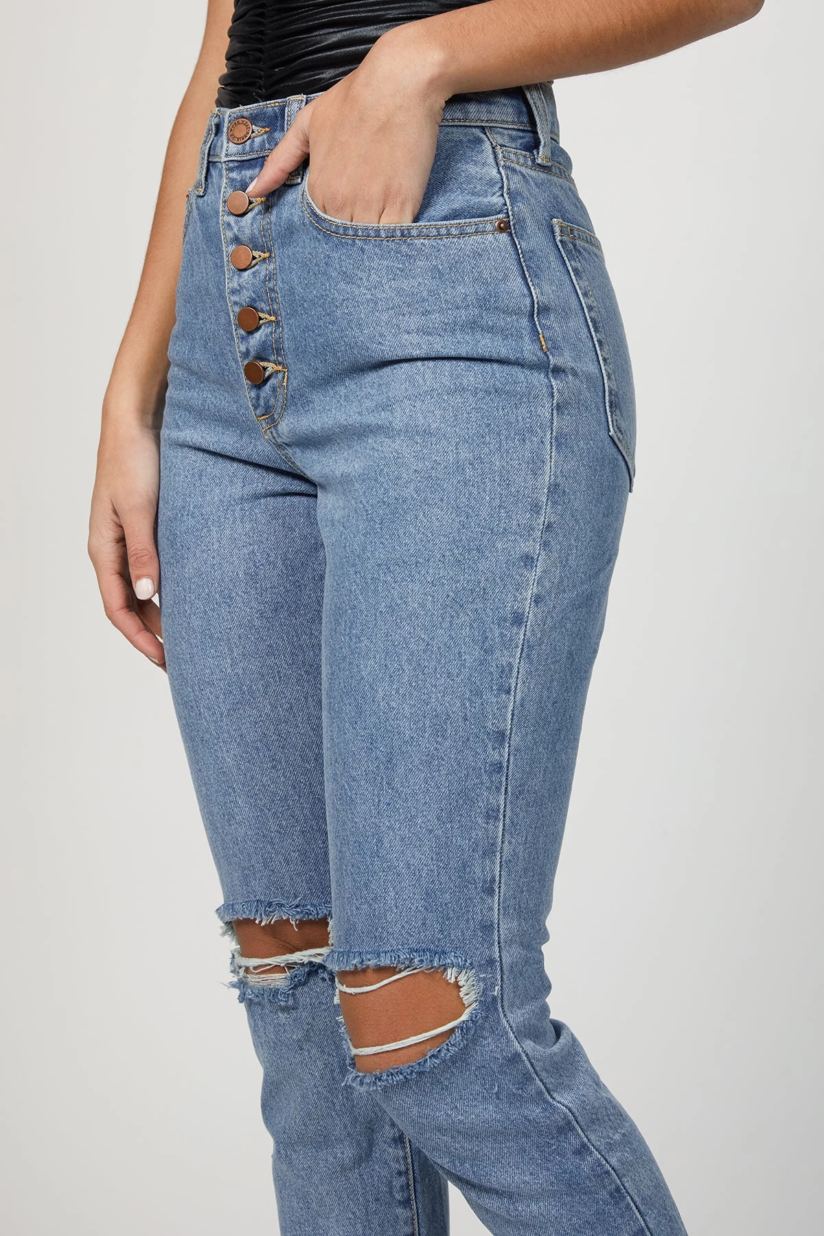The Distressed Danielle Jean is a relaxed wardrobe staple. With vintage charm in a rich indigo cotton denim, these jeans have a rigid feel yet designed for maximum comfort. Signature detailing – five pockets, button closure and an antiqued brass trim – lend a retro feel that’s further enhanced by expert distressing at the knees. With a high rise waist that falls to a straight leg, style them as part of a variety of casual everyday edits.