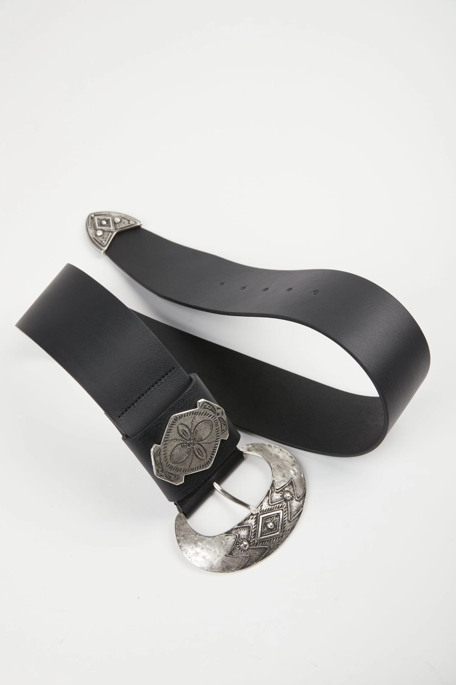 Perfect for cinching one of the label’s flowy dresses, this black belt has a wide shape and is crafted from genuine leather. It gains vintage charm from antiqued silver-tone hardware and has an oversized buckle.