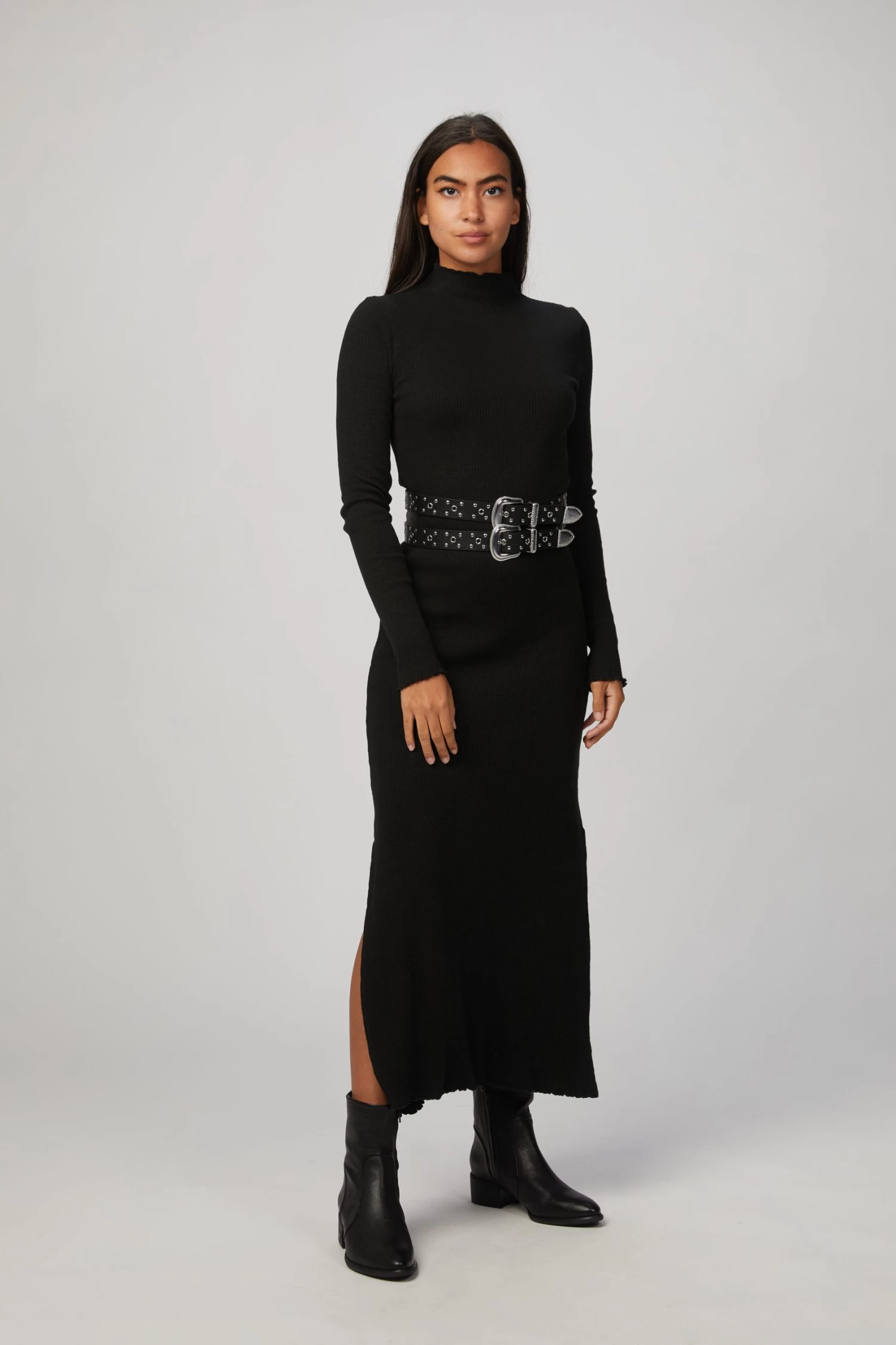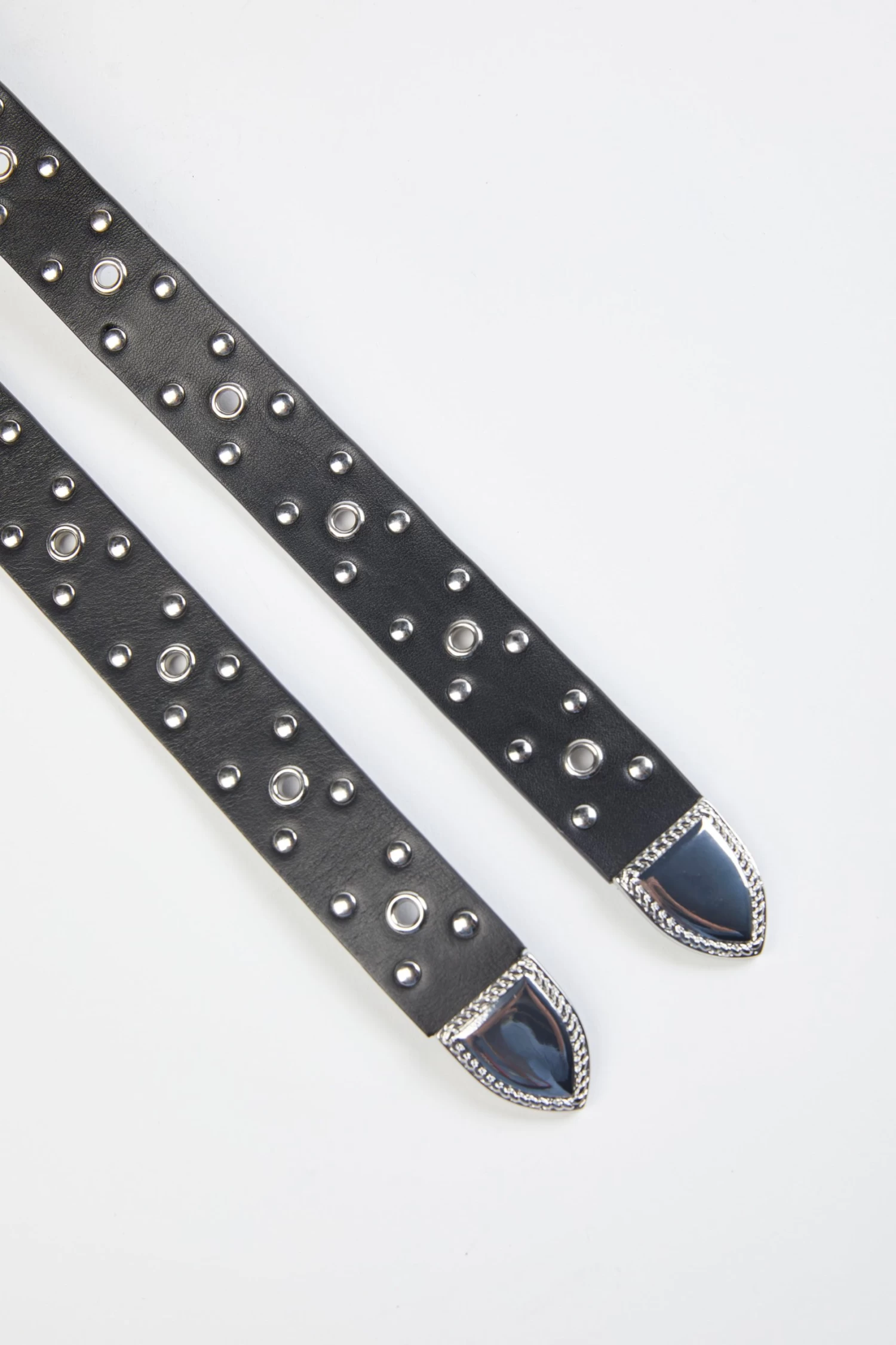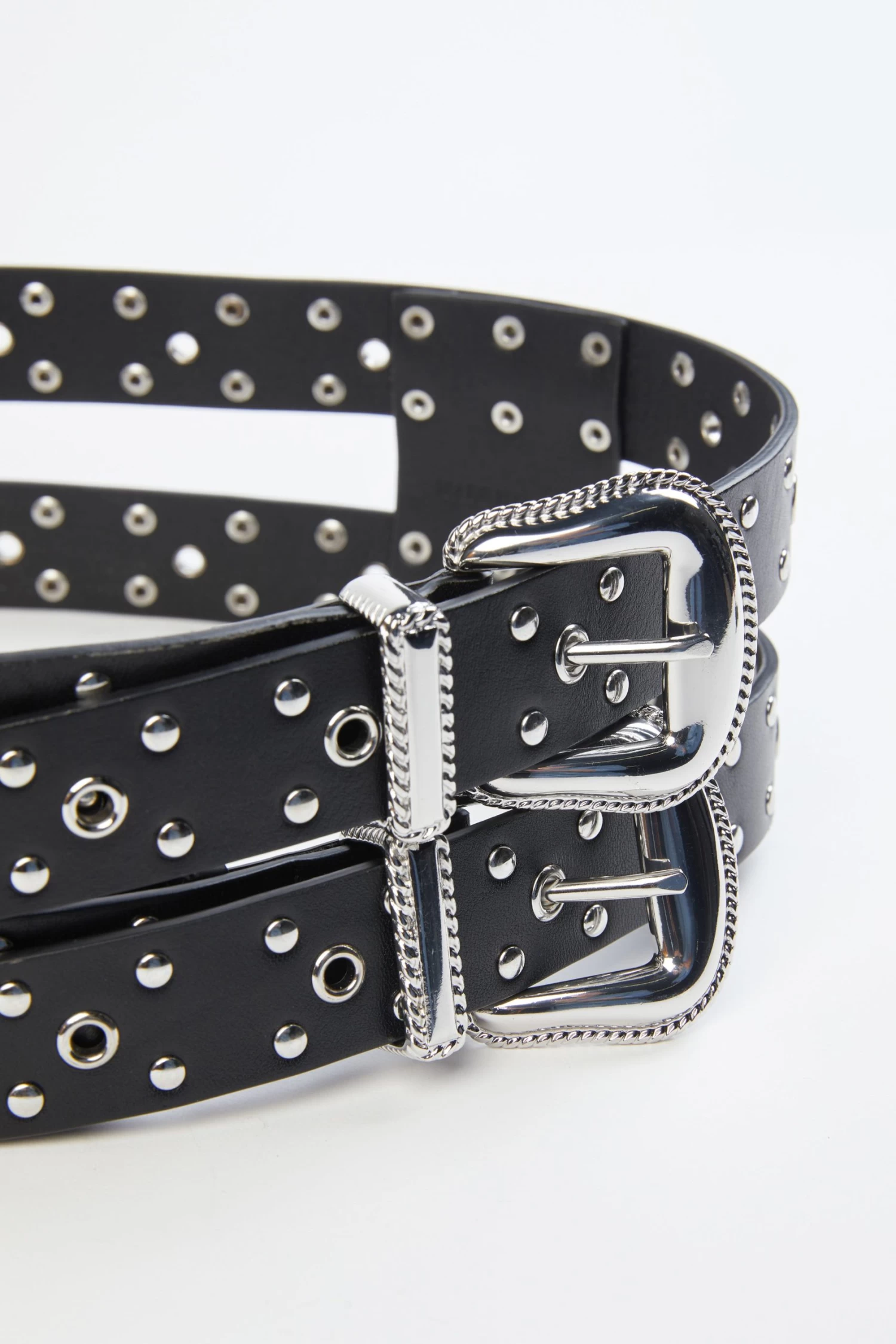 Punctuated with silver metal studs, The Kooples’Â belt is made from smooth calfskin leather and features a silver double buckle. The exaggerated width accentuates the waist when paired with a flowy dress.