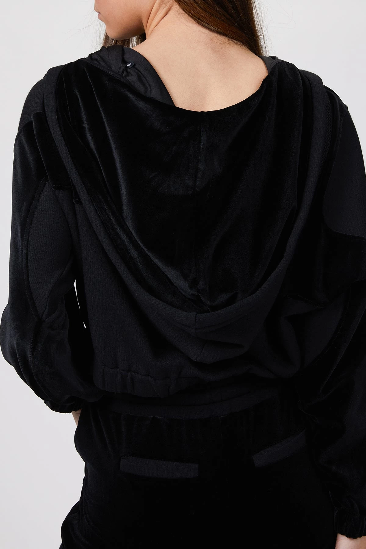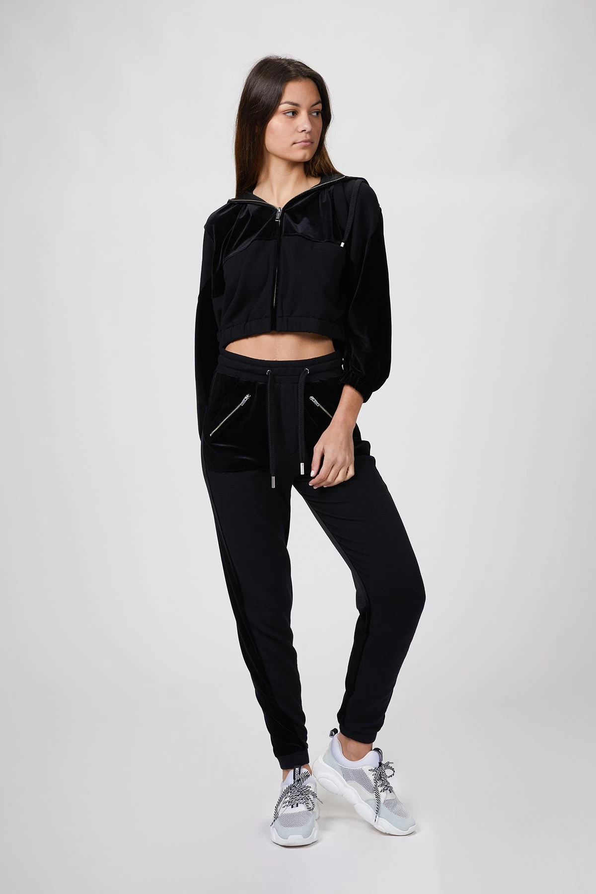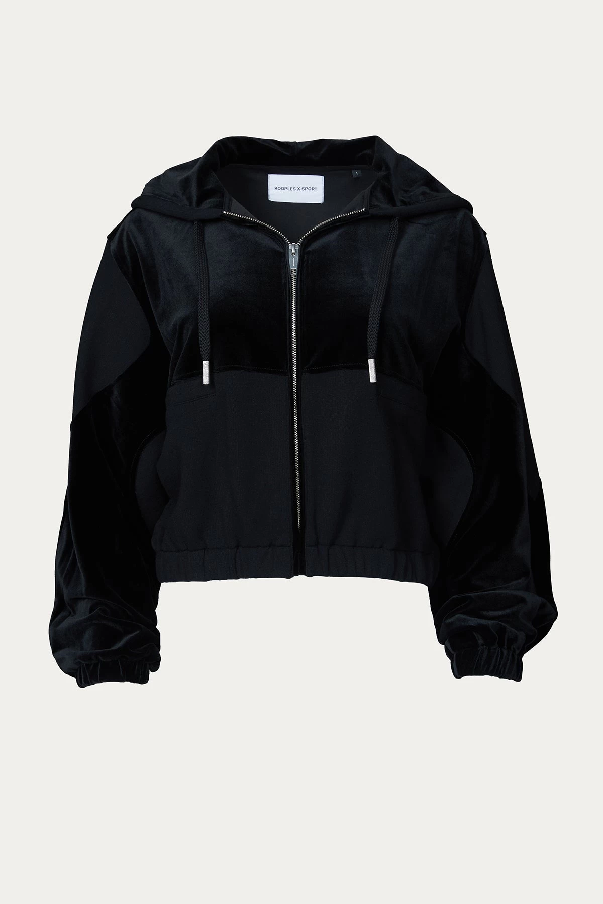 Ultra comfortable, The Kooples’Â zip-up hoodie combines a blend of performance and style and is made from contrasting fabrics in soft and stretchy velvet and fleece. The relaxed silhouette is enhanced by drop shoulders, a cropped hem and faux front pockets. Pair it with the matching joggers and sneakers for your next coffee run.