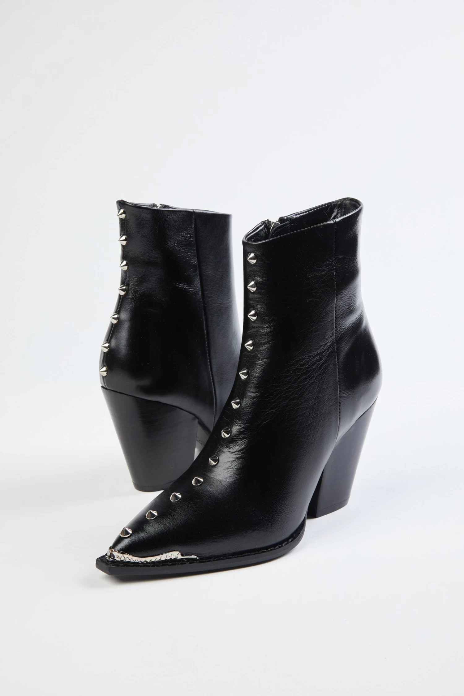 Made in Europe from smooth black calf leather, The Kooples’ ankle boots feature silver studs up the center and a cuban heel. They have a steel-toe detail with a matching metal ornament on the heel. Wear yours with pleated skirts and flowing floral print dresses.