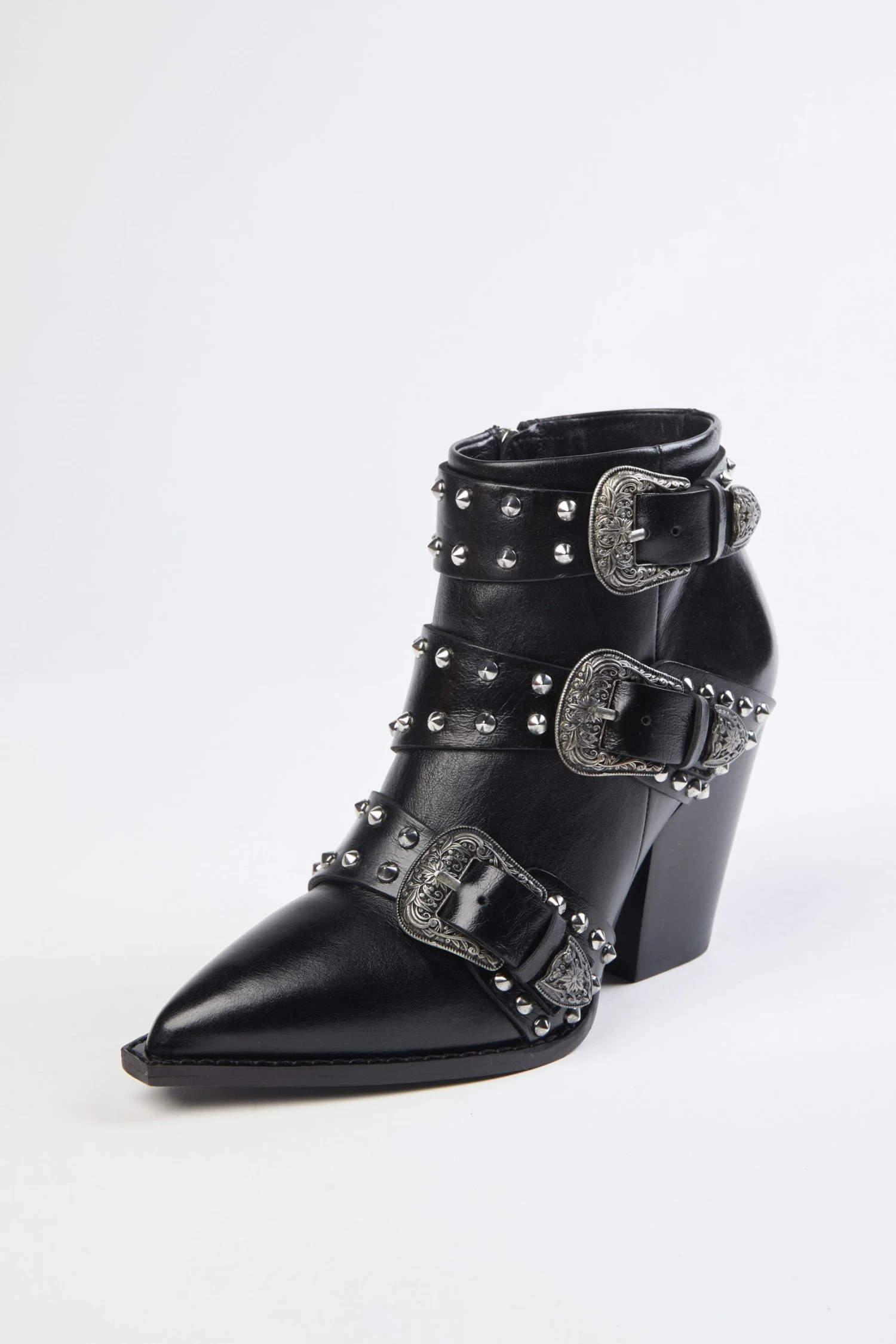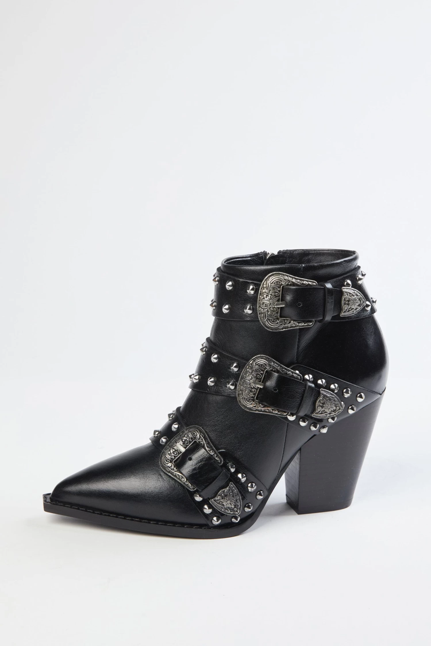 The Kooples western-inspired ankle boots have a trio of buckle-fastenings punctuated with silver studs. They are crafted from smooth black leather and have side zippers for easy on and off. Wear yours with anything from jeans to dresses.Â
