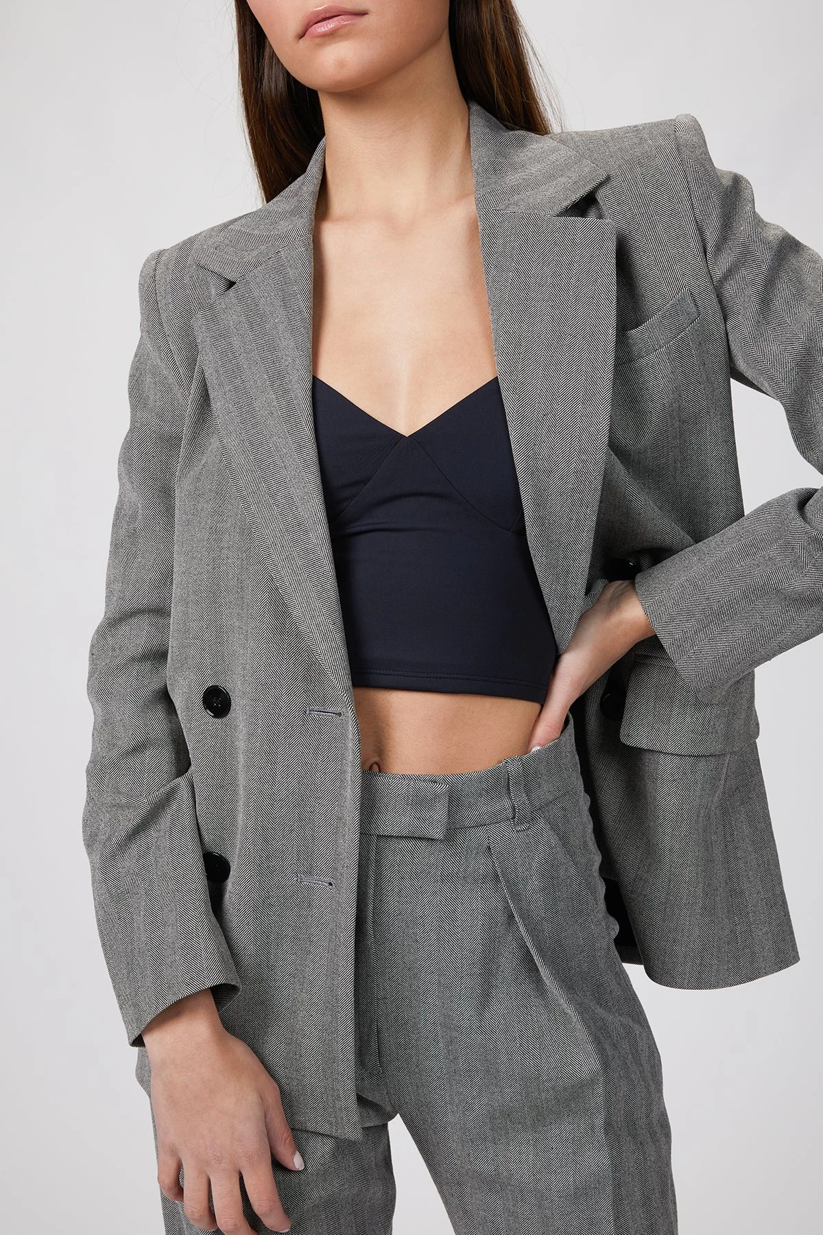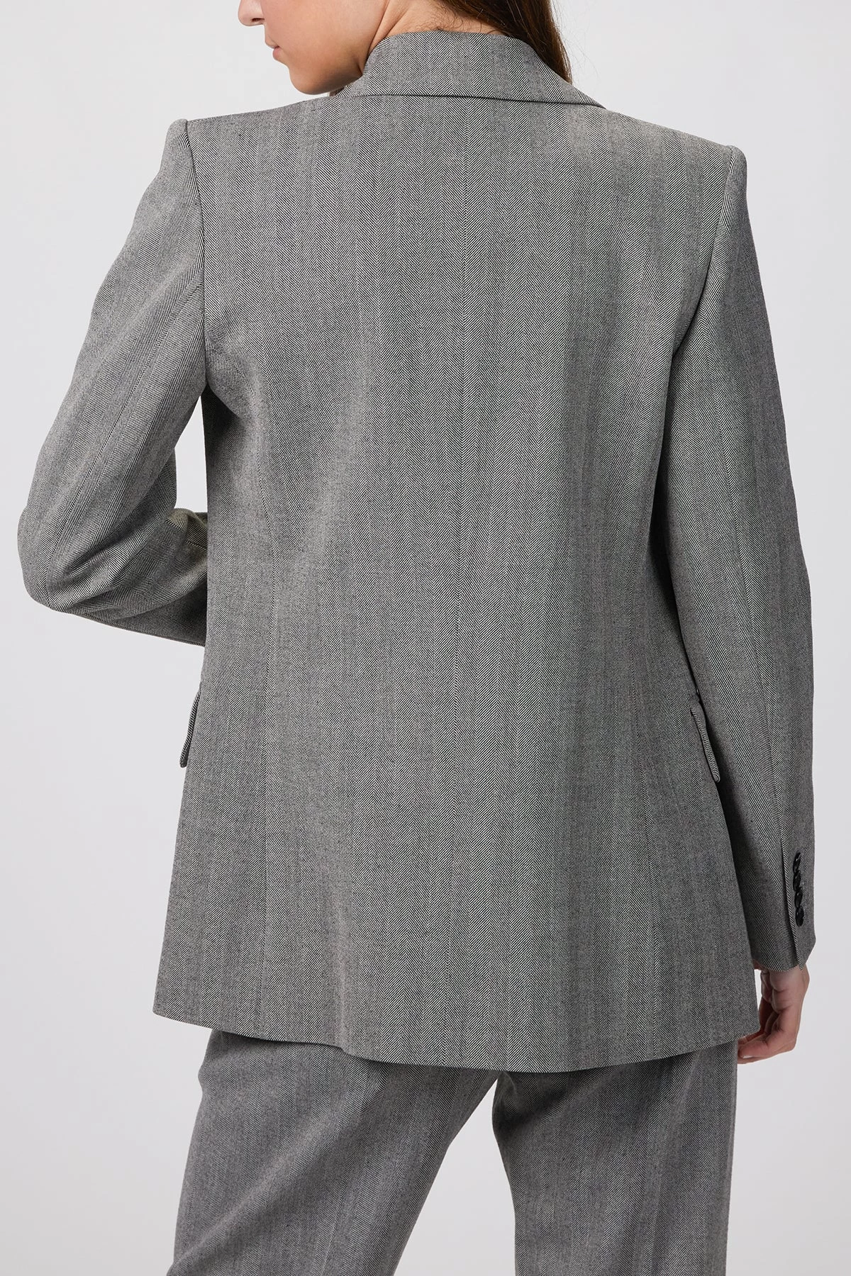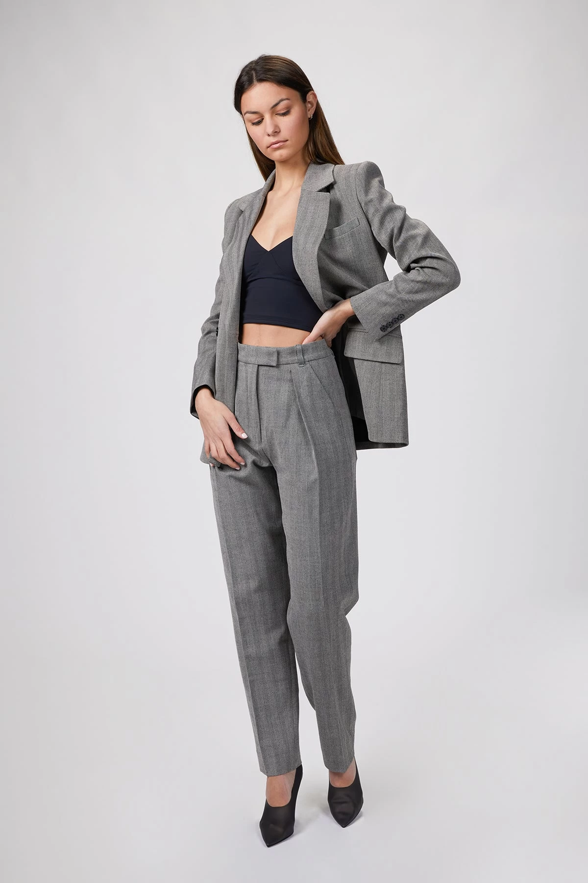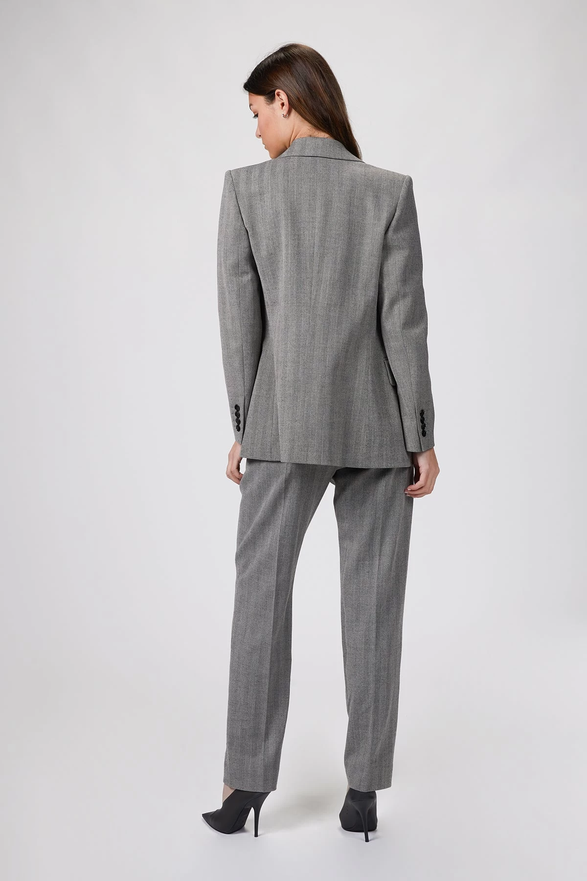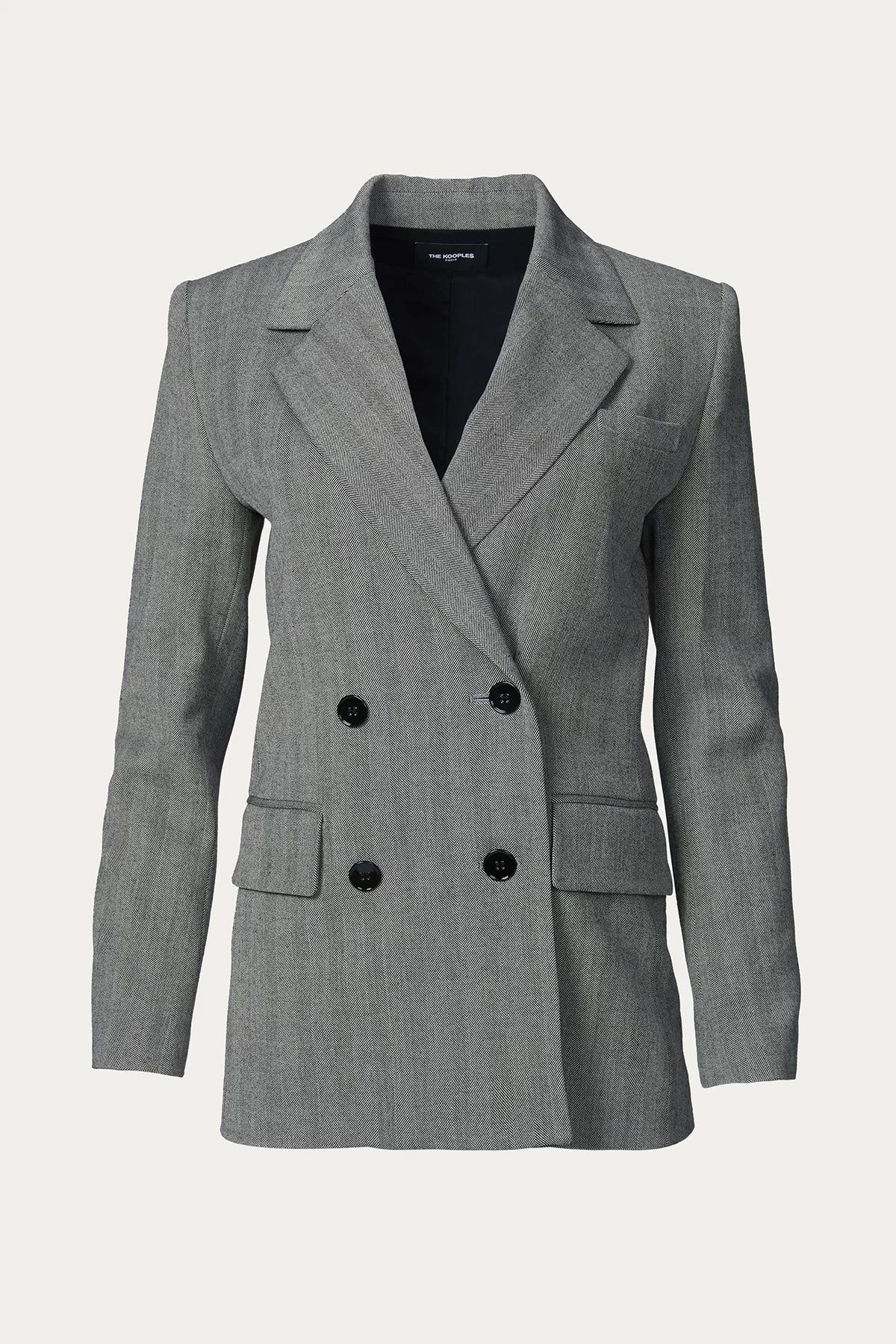 Crisp tailoring takes on a new meaning with this black and white blazer from The Kooples. Sharply cut with shoulder pads and double-breasted fastening, it’s further elevated by a directional herringbone weave. Black leather buttons and faux-flap pockets are refined finishing touches. Complete the suit with the matching herringbone suit pants.