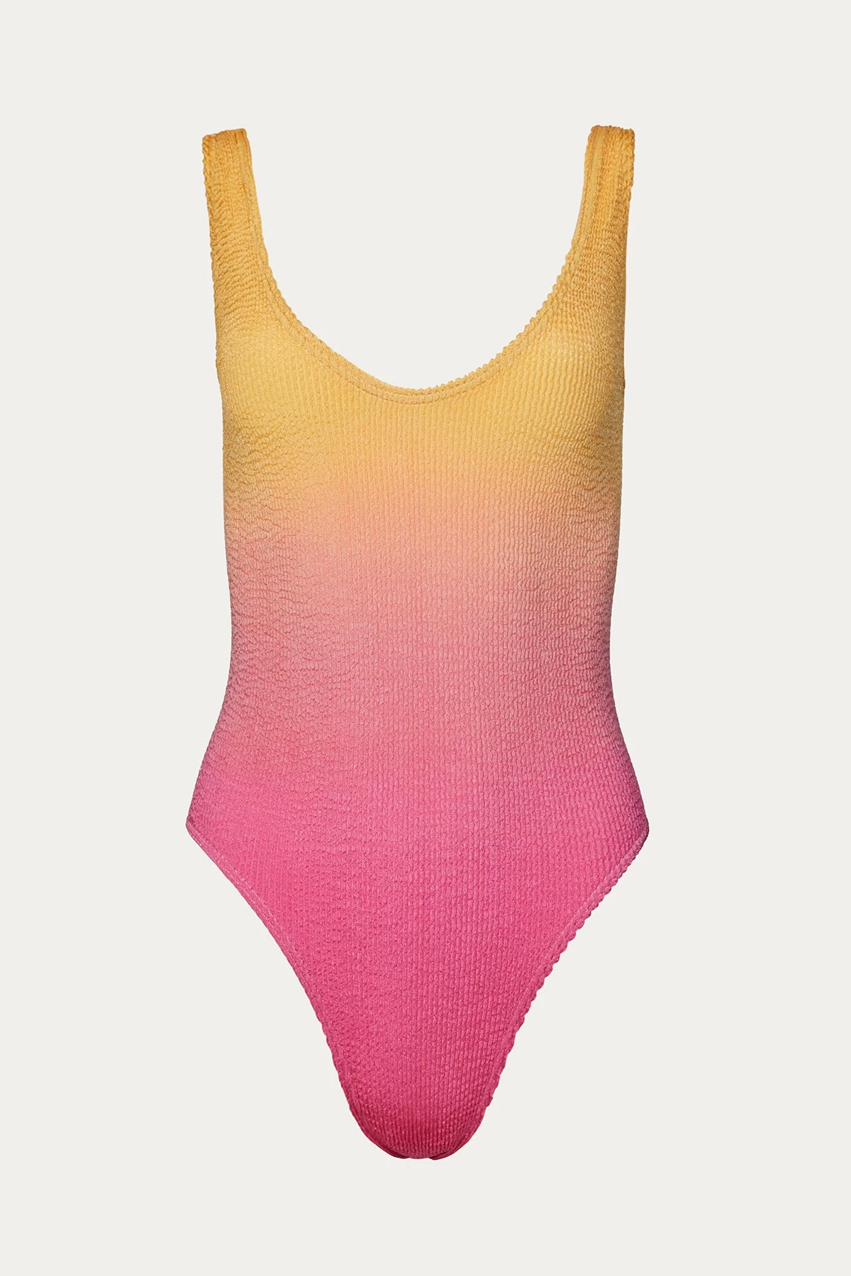 This figure-hugging ‘Mara’ one-piece swimsuit is made from ribbed seersucker fabric with a retro crinkle finish – exclusive to the label. It has an ombré palette that flows from an orange to pink hue the label calls ‘sunset’. The one-piece features a soft V-neck and scooped back with medium coverage. One size fit.