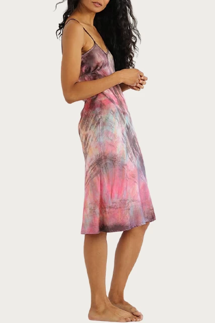 Haley Solar is named for her in-house, locally made pieces that are sourced and sewn using up-cycled fabrics – leaving a tiny carbon footprint. Cut on the bias, this slip dress is made of lustrous silk and tie-dyed in bright hues. The hem hits below the knee and the straps are adjustable so you can customize the fit.