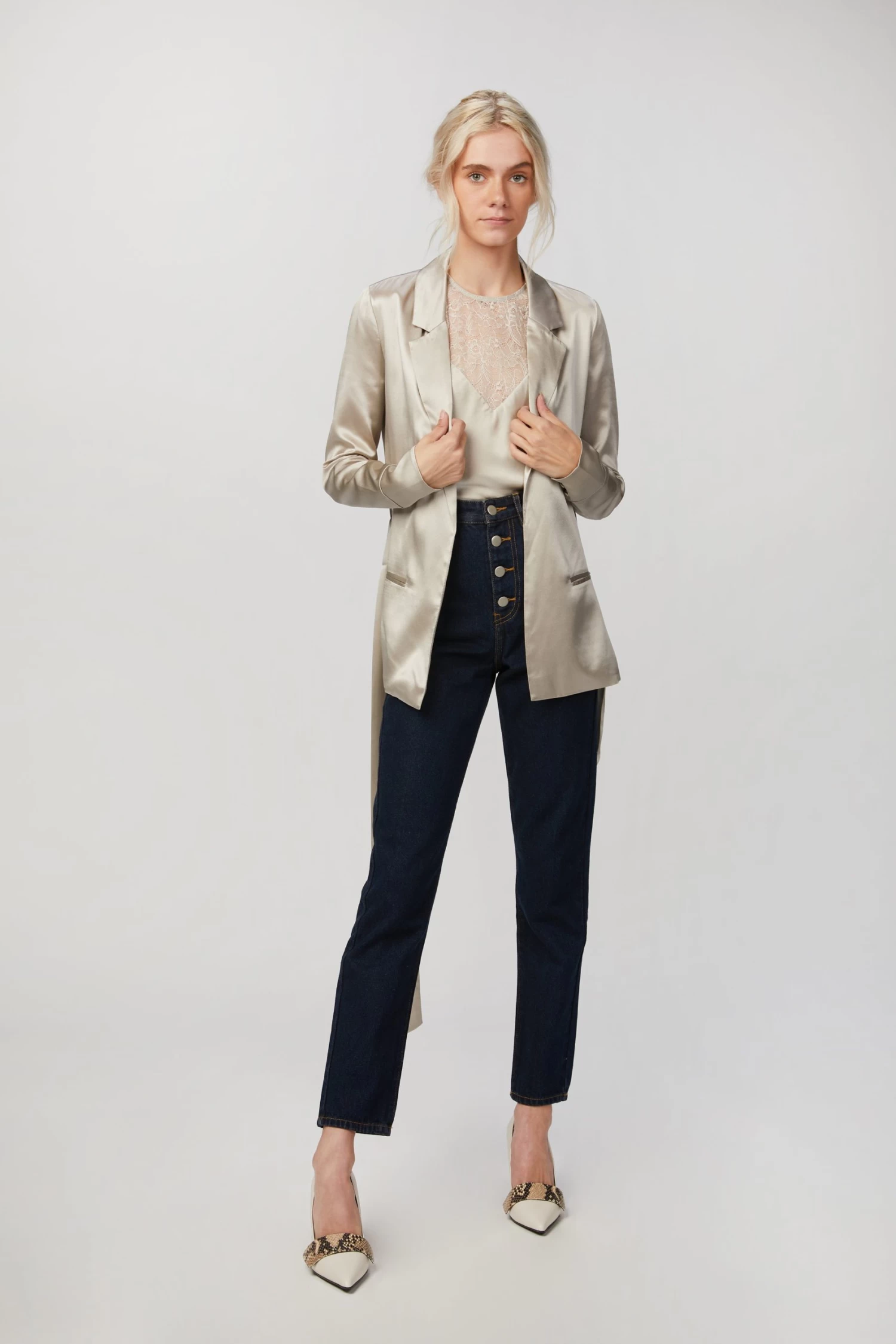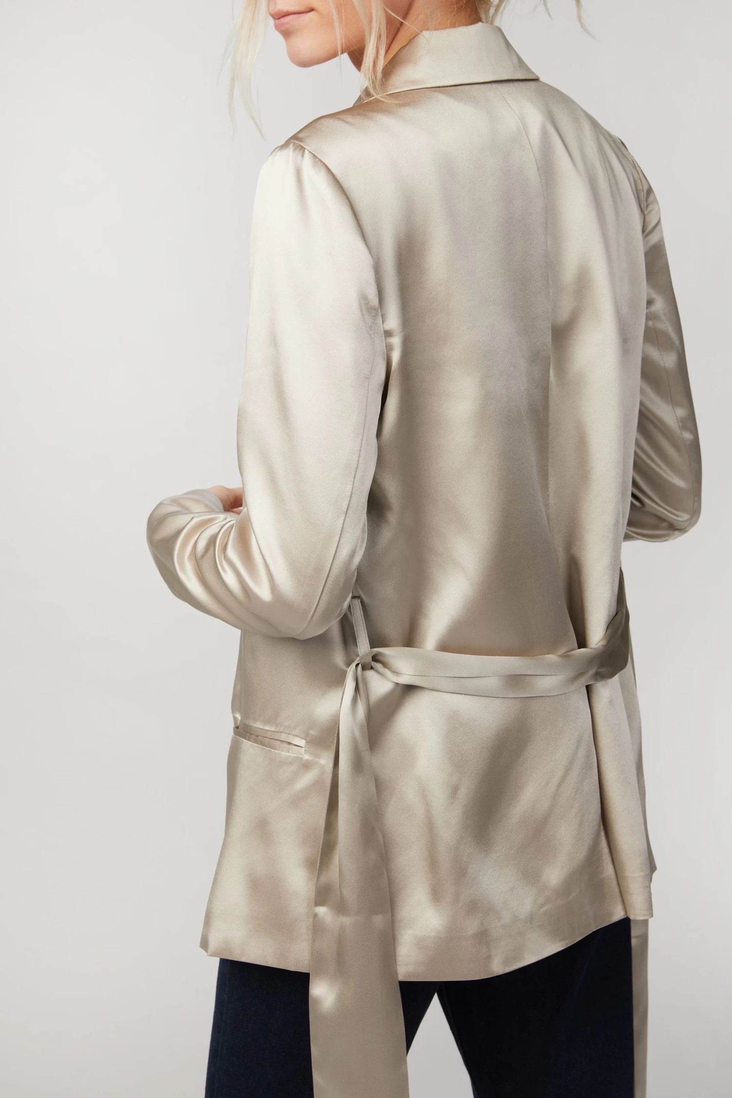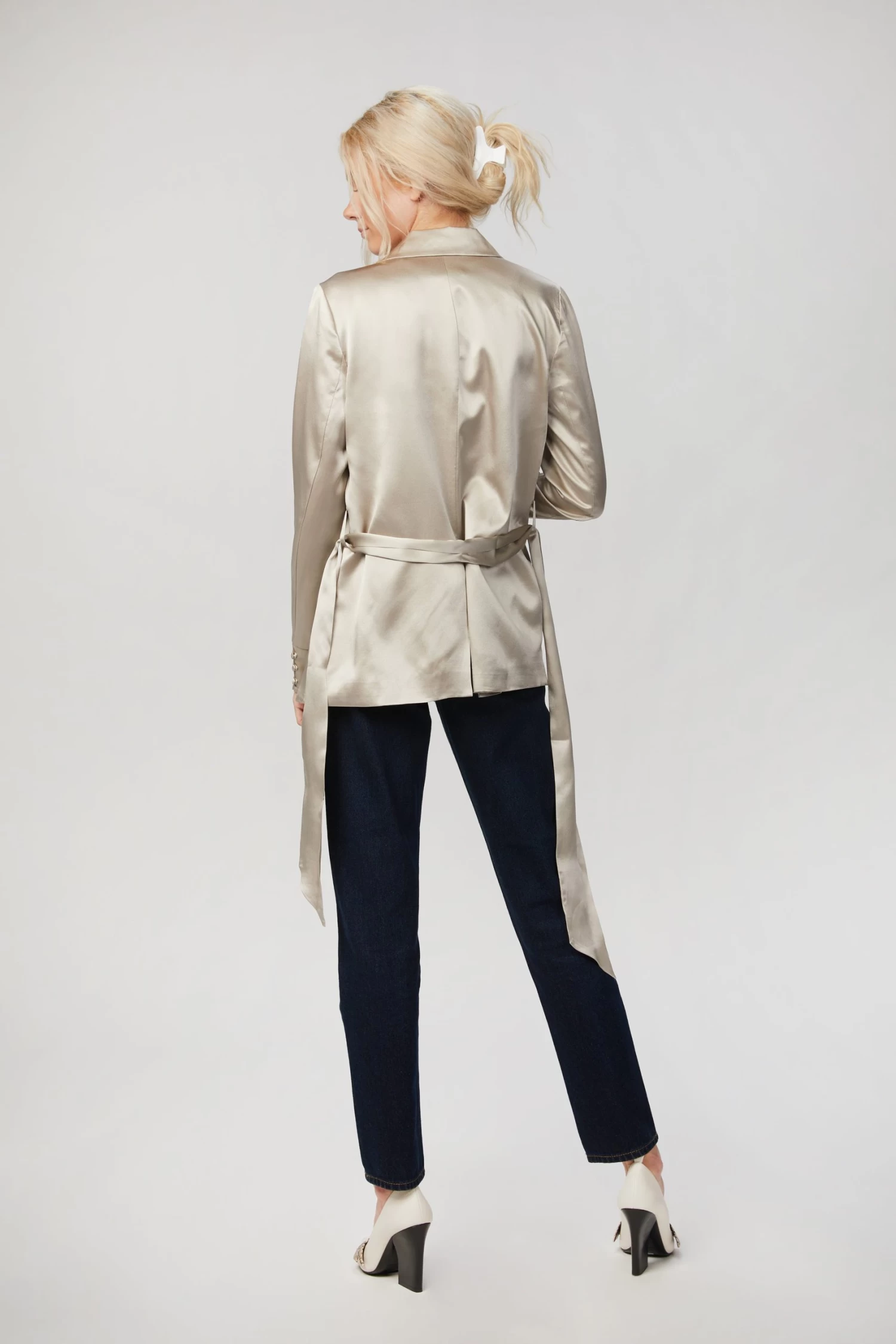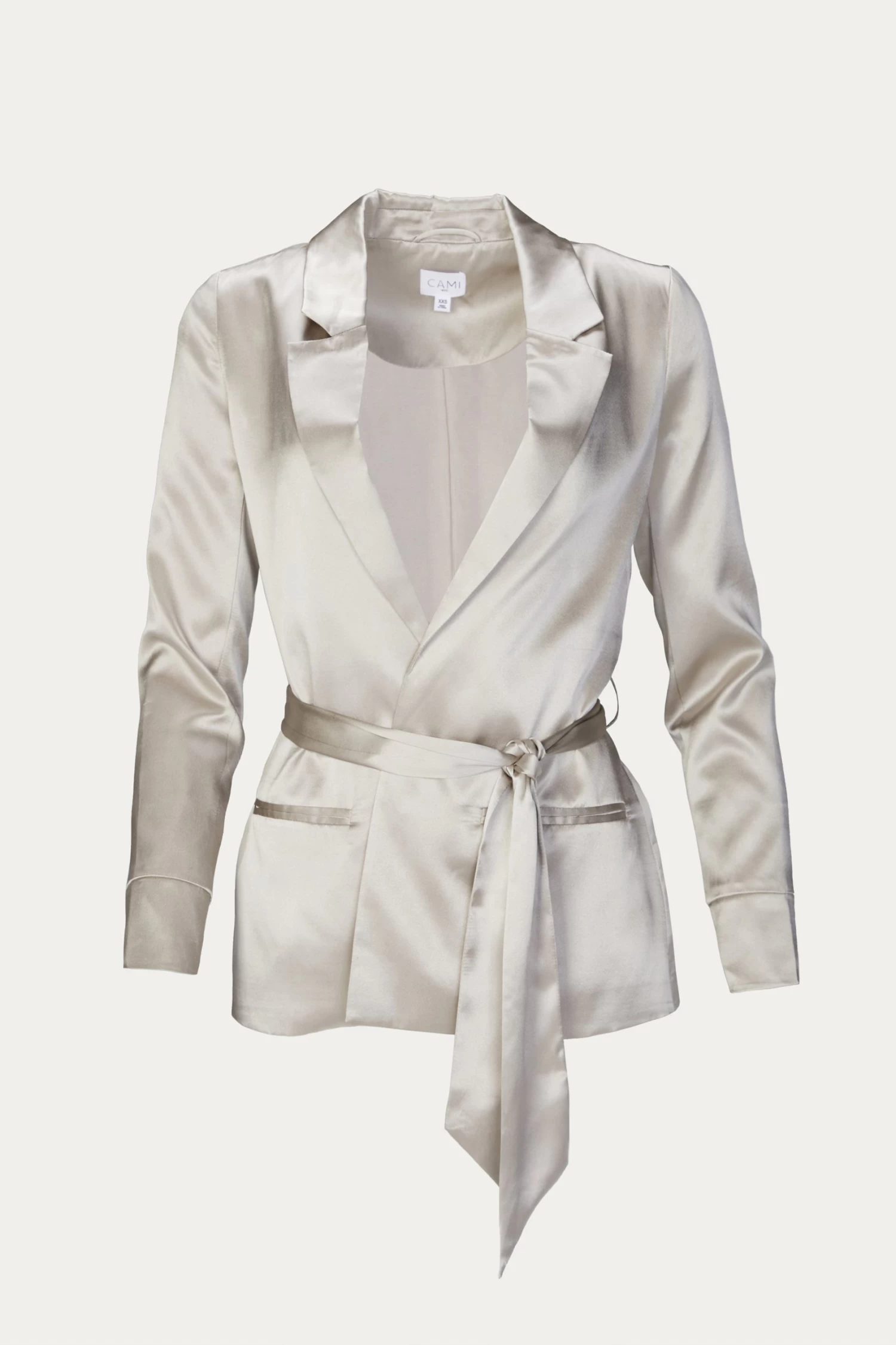 Cami NYC’s ‘Tippy’ blazer is made from satin in a pearlescent hue. It has soft shoulders and sweeping shawl lapels that perfectly complement the slightly loose fit. Use the optional belt to cinch your waist.