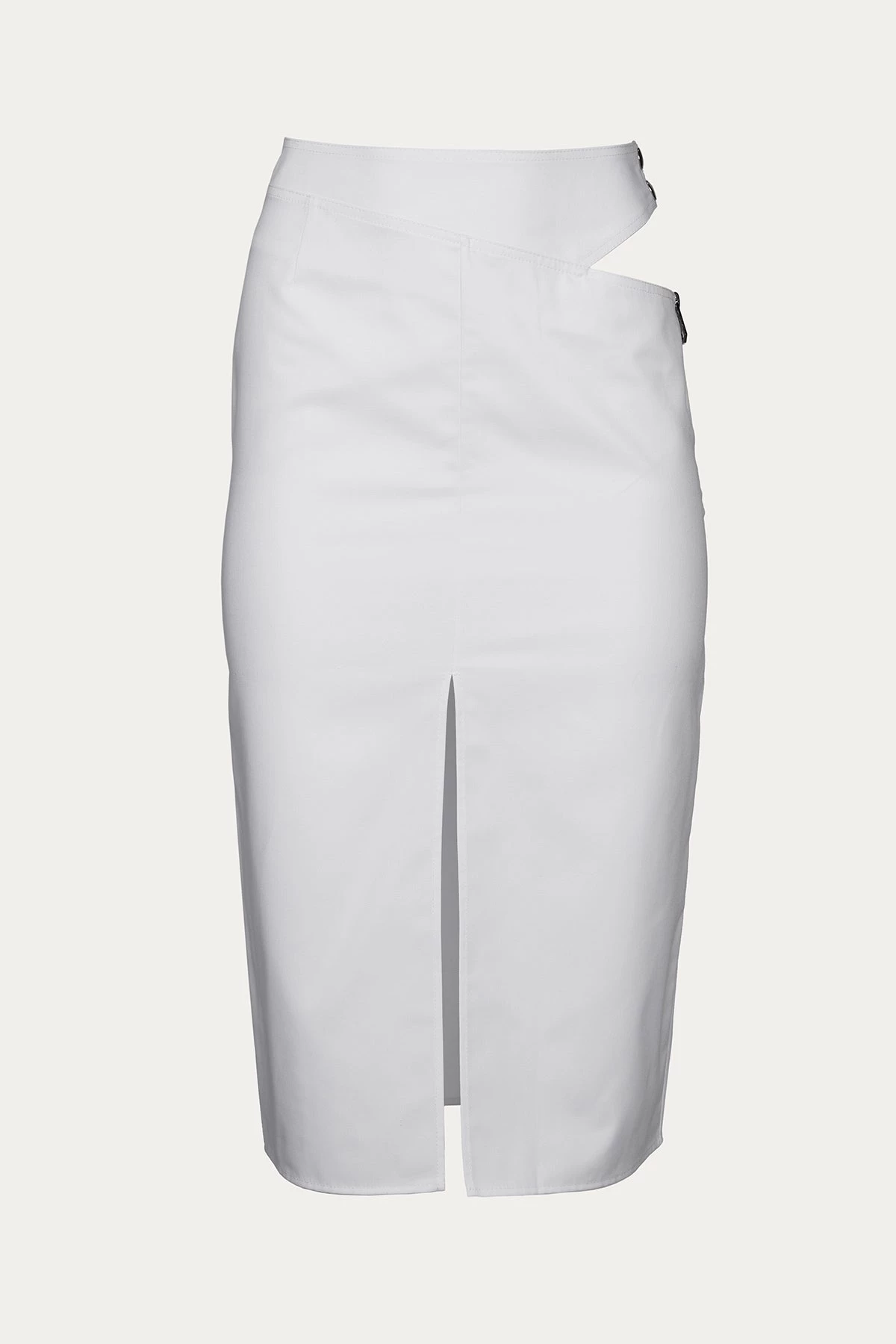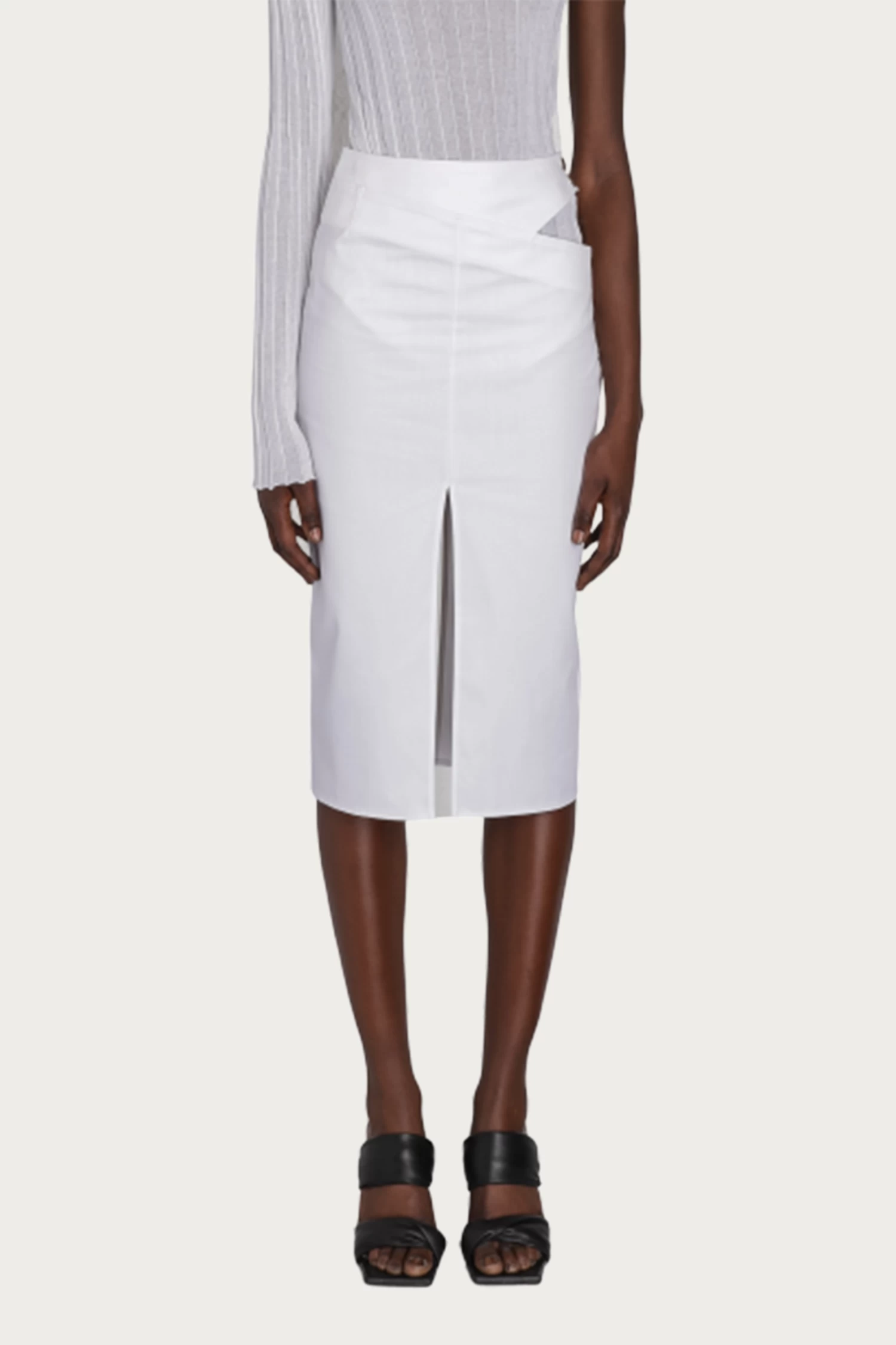 Boyarovskaya is known for their edgy silhouettes and offbeat cutouts and this ‘Tongs’ skirt is right in line with that aesthetic. Made in Italy from faux white leather, it has a high-rise waist and slashed hem. Pair yours with a cropped top to highlight the side cutout.