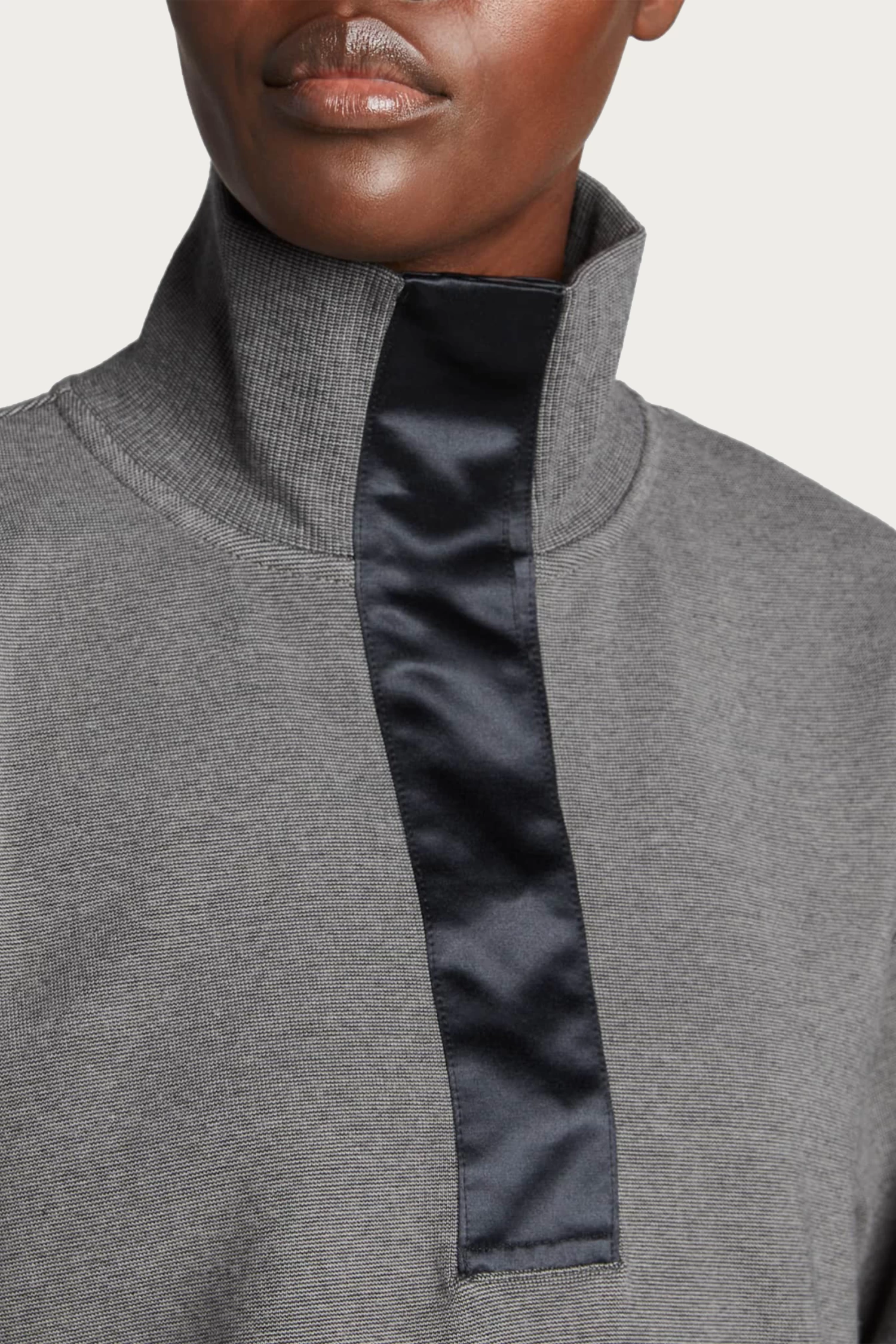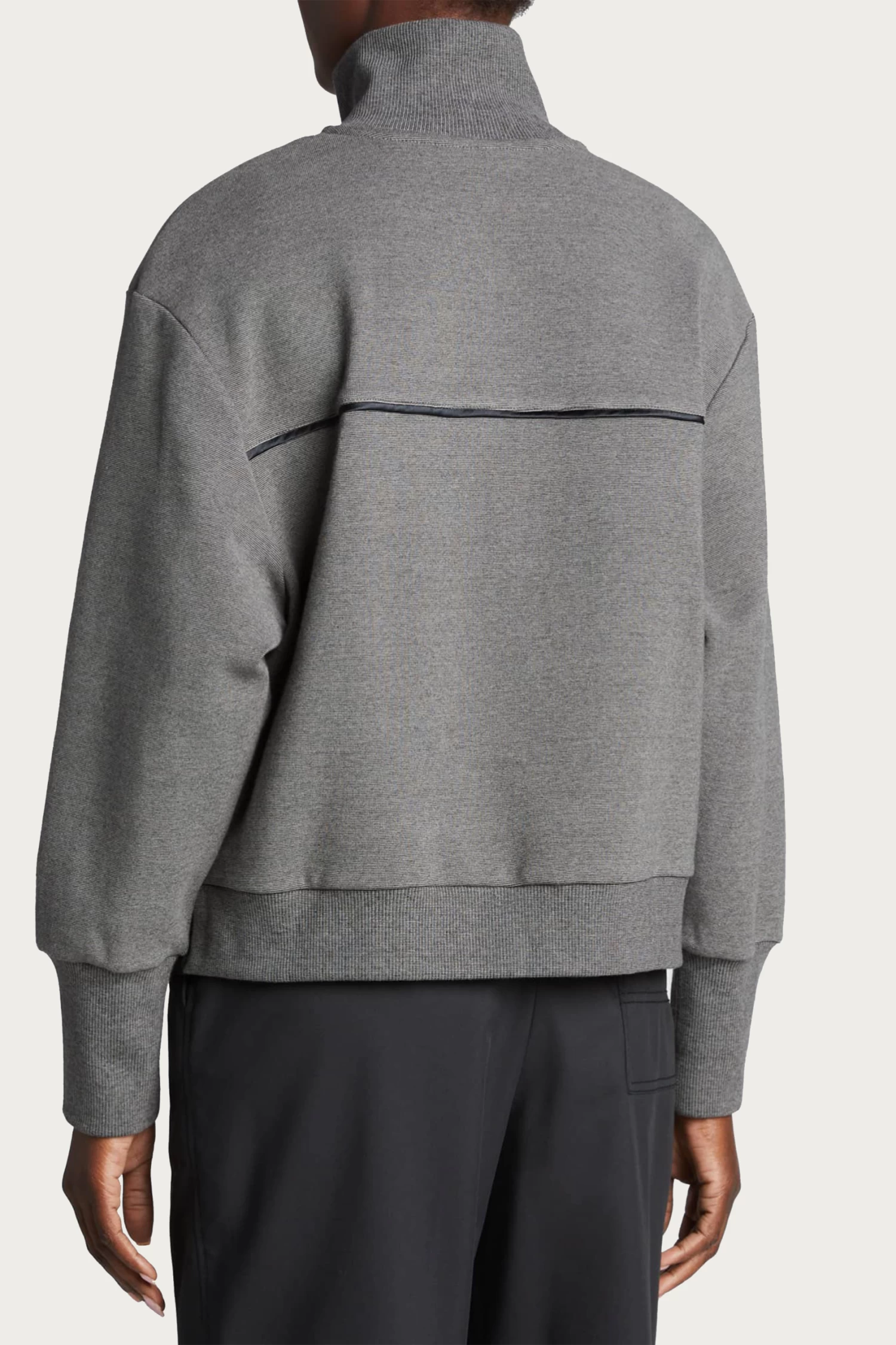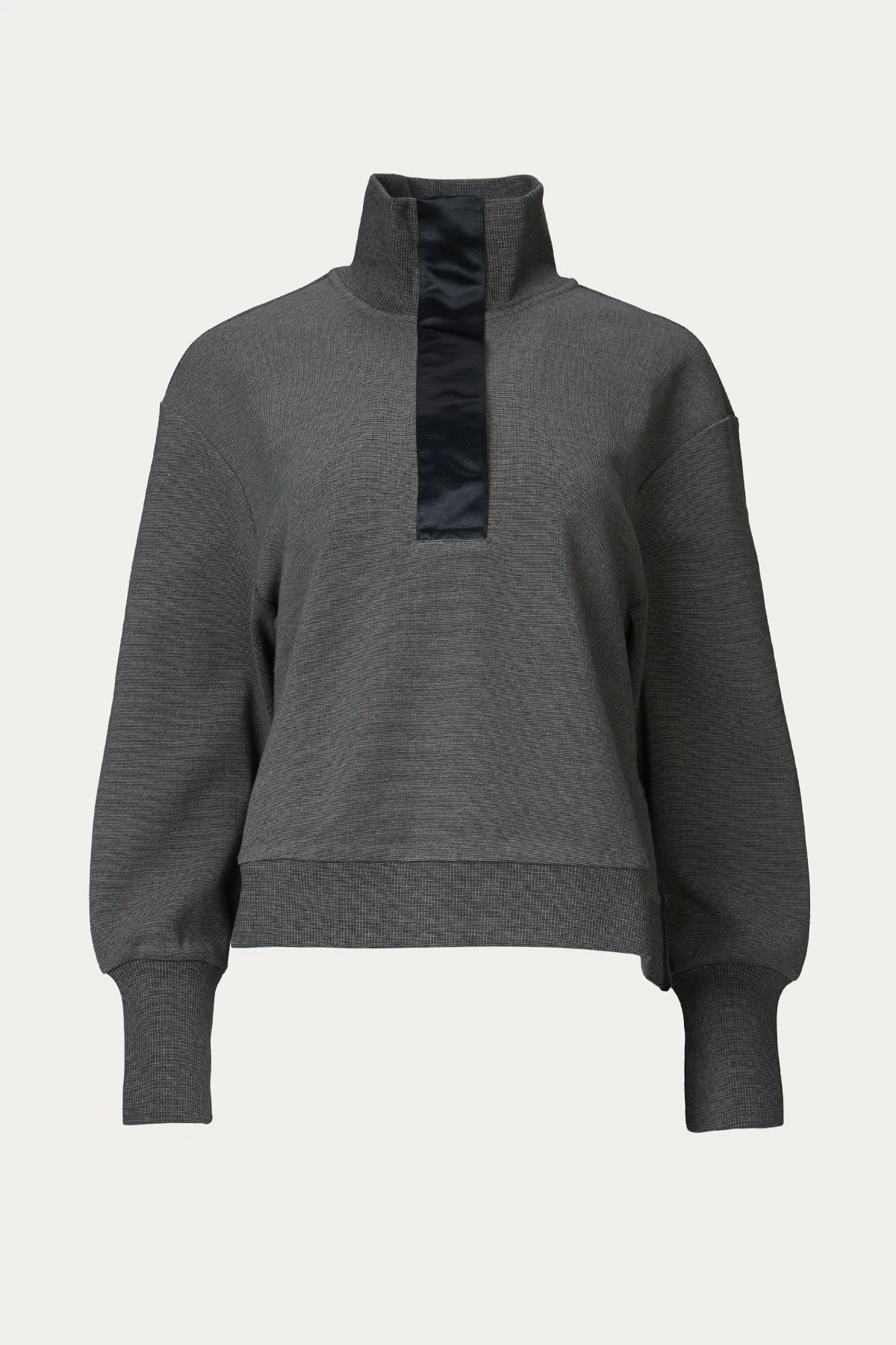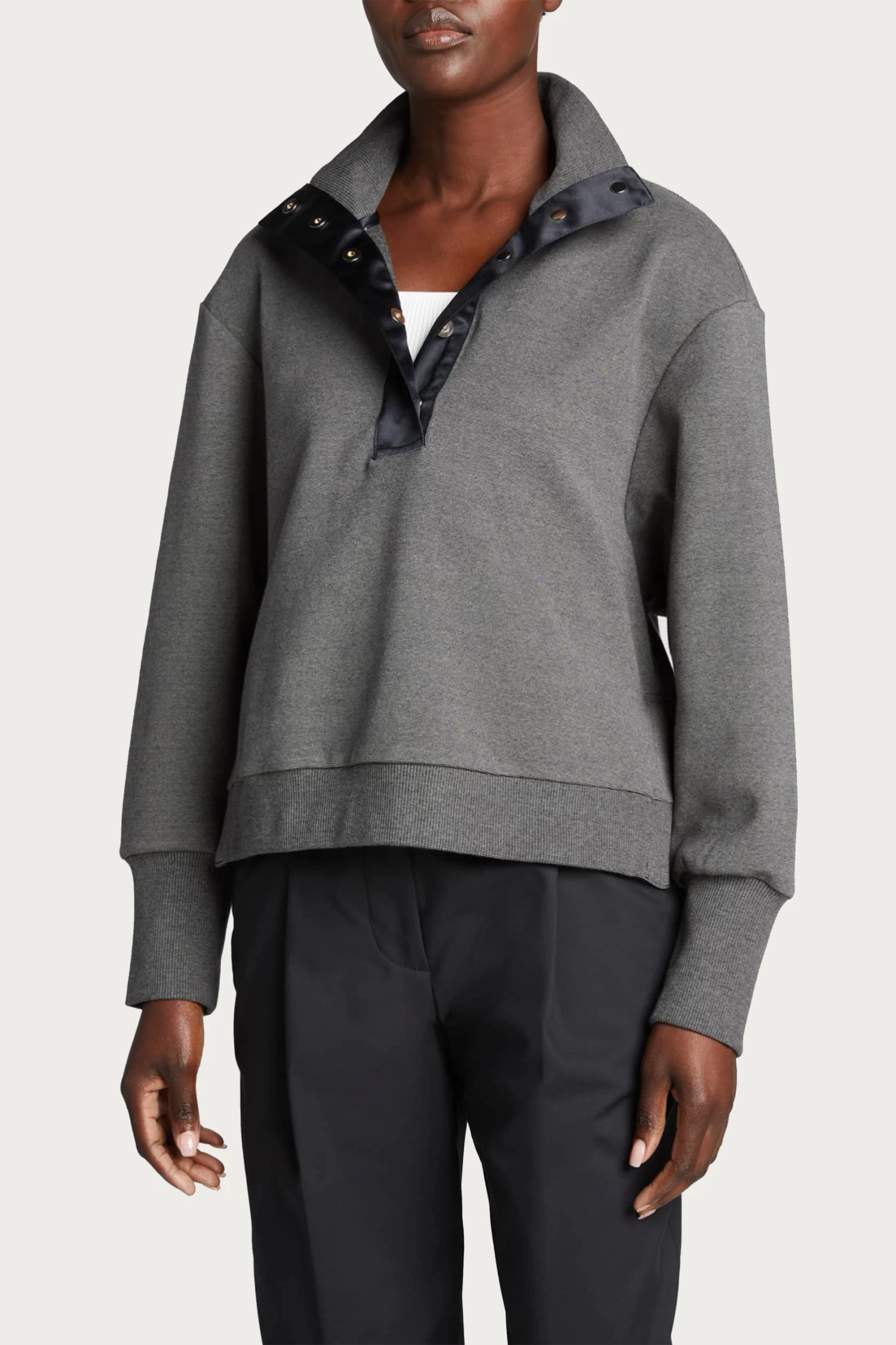 Lounge-worthy comfort meets simple elegance in a half-zip pullover. This pullover features concealed magnetic snaps, dropped shoulders and ribbed trim details. The sateen details at the placket, side vents and back yoke add style. Throw it in your exercise bag to keep your muscles warm post-workout and style with tailoring or jeans when outside the gym.Â