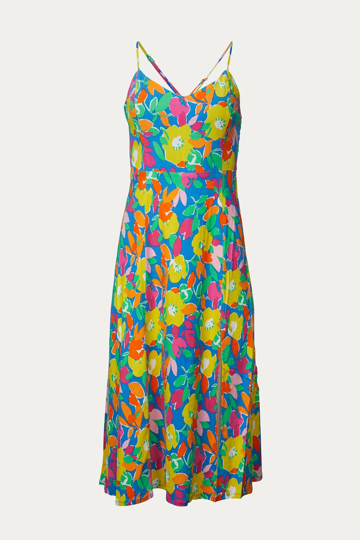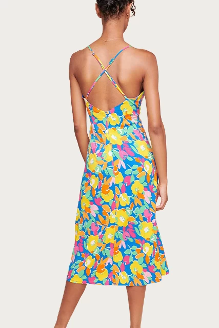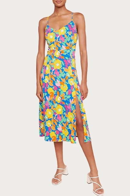 Sugarlips’ dress is printed with colorful blooms and is the kind you can wear to a summer party or beach vacation. Cut from modal and infused with stretch, it has delicate spaghetti straps that cross at the back and a thigh-high split. Style it with mules, stiletto sandals or sneakers.